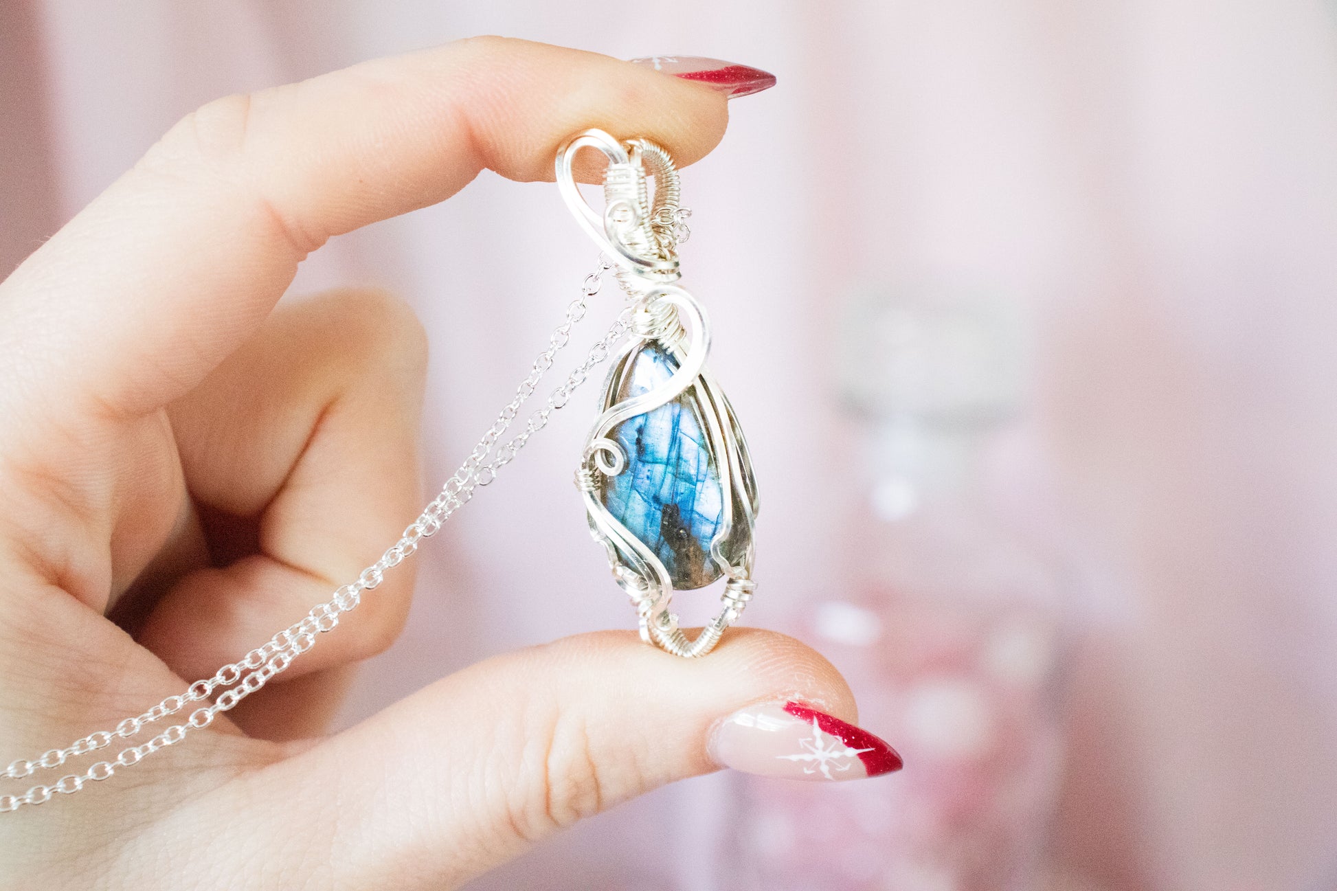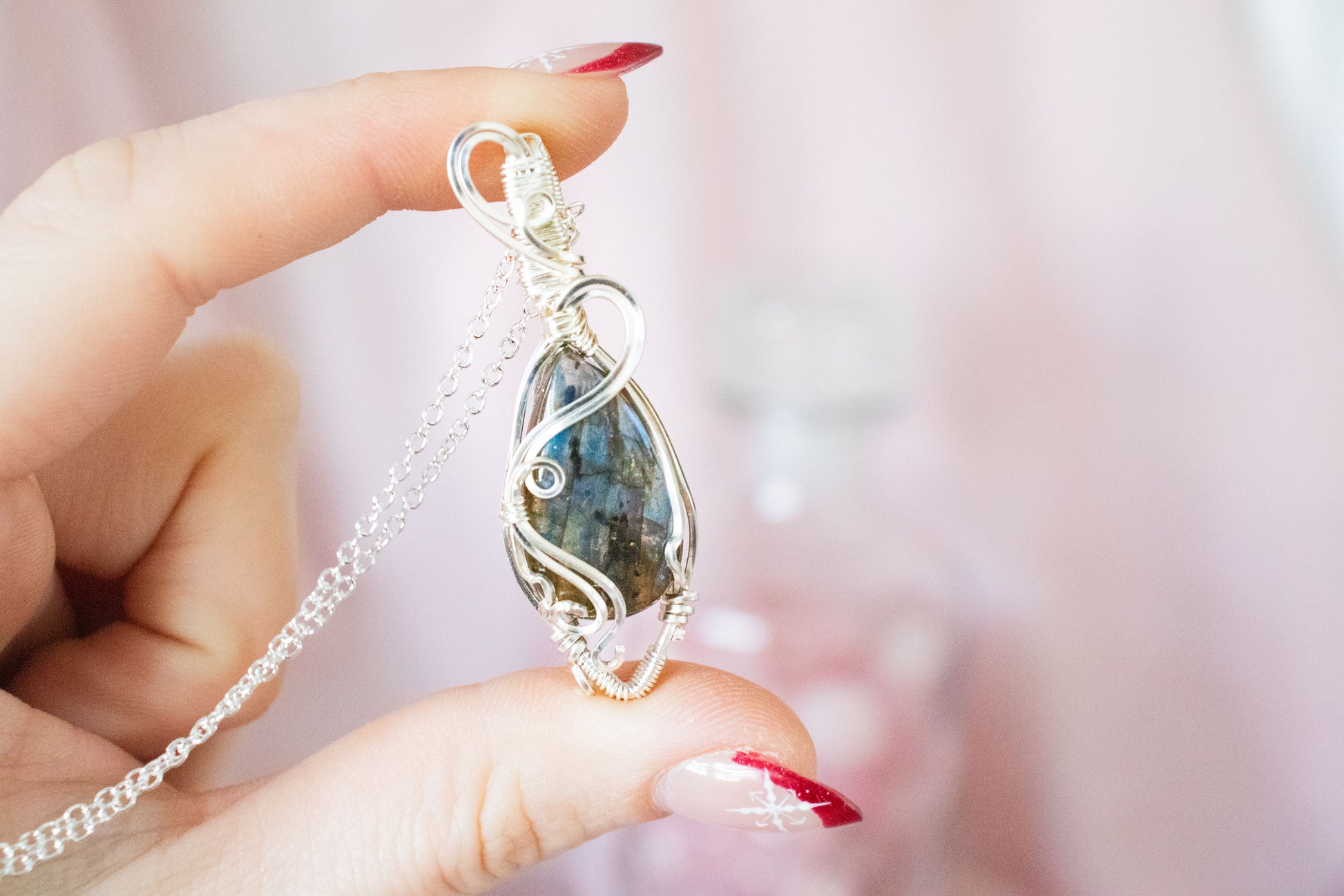 Made with silver-plated silver-colored copper wire, a pear labradorite stone, and 18" silver-colored chain.