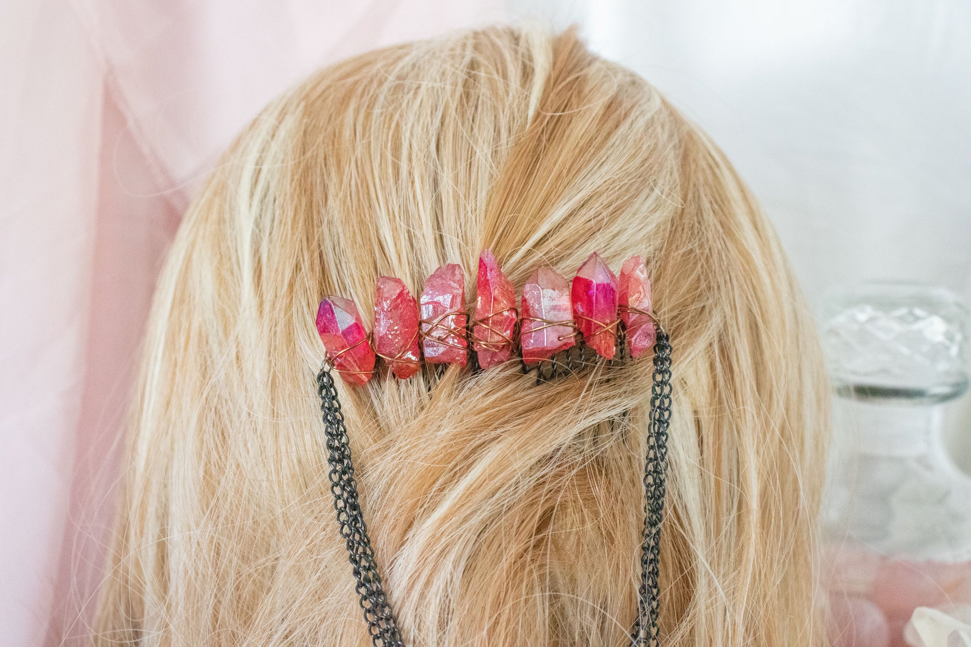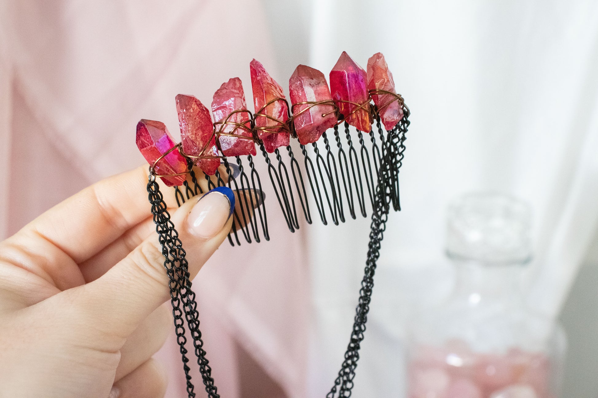 Infuse your everyday style with a touch of magic using our Black + Red Crystal Hair Comb. Crafted with vibrant colored quartz, these combs bring the energy and beauty of crystals to any hairstyle. Designed with 10-prong wire combs, they are suitable for all hair lengths and thicknesses, ensuring a secure yet comfortable fit. Handmade with care, each comb is truly one of a kind—perfect for adding subtle sparkle without committing to a full crown.