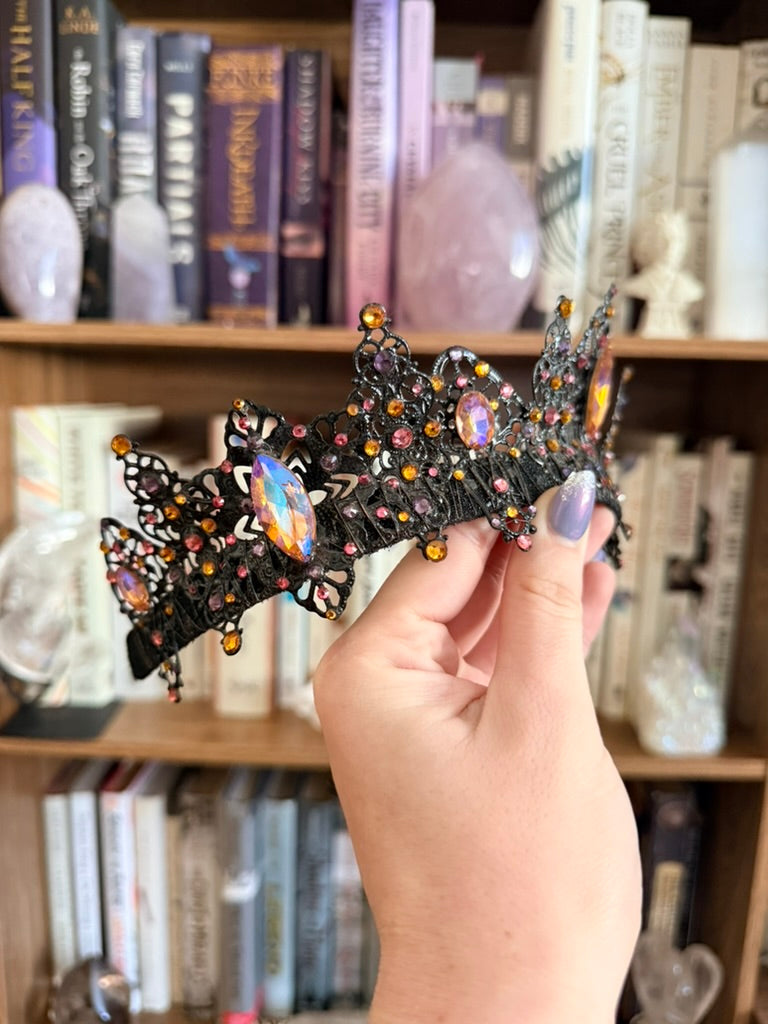 Our black + sunset crown is all about extravagance, designed to be a true statement piece. Ideal for anyone seeking a bold, unforgettable look, each crown is handcrafted with intricate details that make it one of a kind. With a flexible yet secure fit, this crown lets you shine as bright as your inner magic.