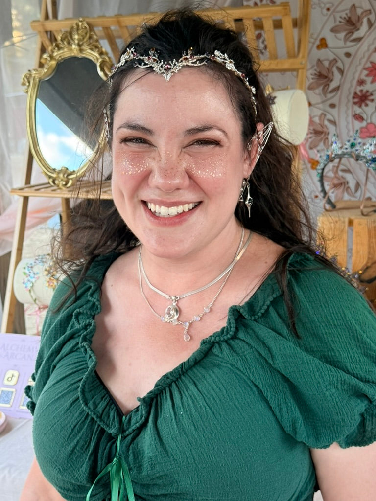 Embrace an elven-inspired elegance with our black + sunset flower moon circlet tiara, designed to sit gracefully on the forehead. Each circlet is handcrafted with intricate detail to bring a mystical charm that elevates any outfit. Flexible and lightweight, it comfortably molds to your head, giving you the timeless beauty of fantasy realms with a real-world touch.