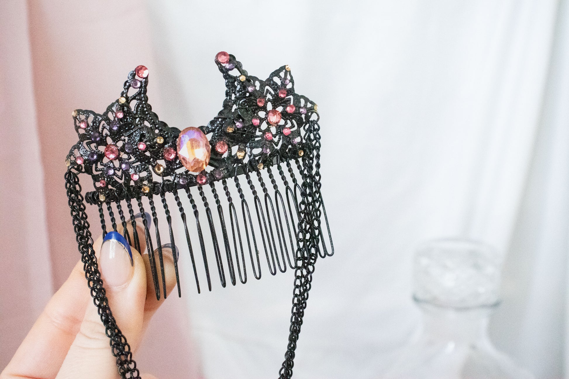Comb features black metal filigree pieces, black chain, and rhinestones in rose pink, purple, and gold.