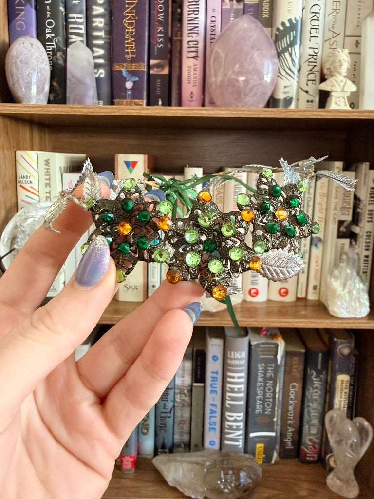 Circlet features bronze metal filigree pieces, floral wire, silver leaf ribbon, green ribbon, and rhinestones in lime green, emerald green, and gold.