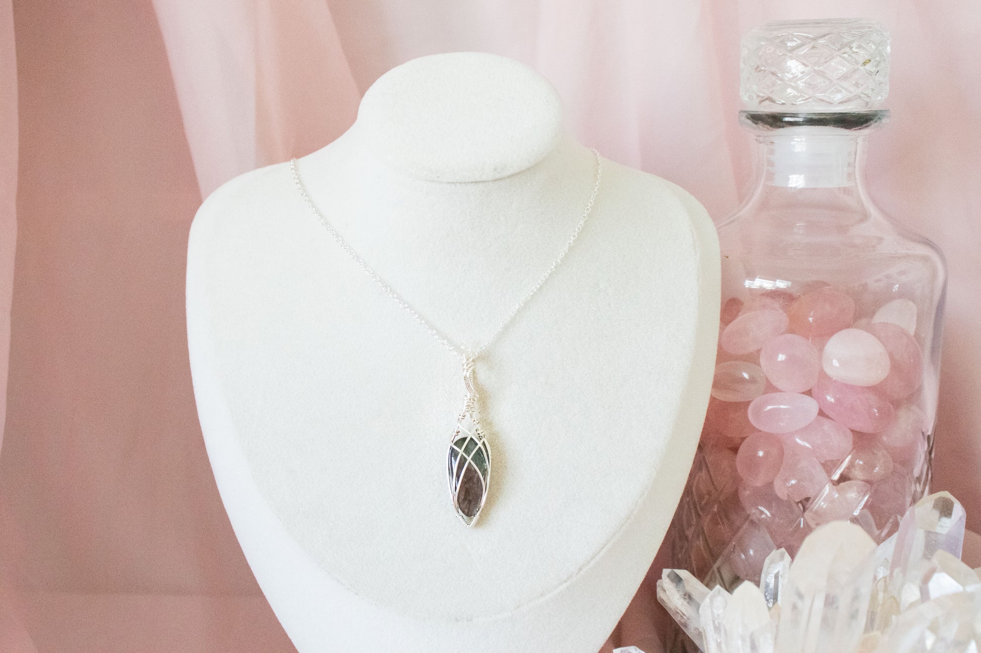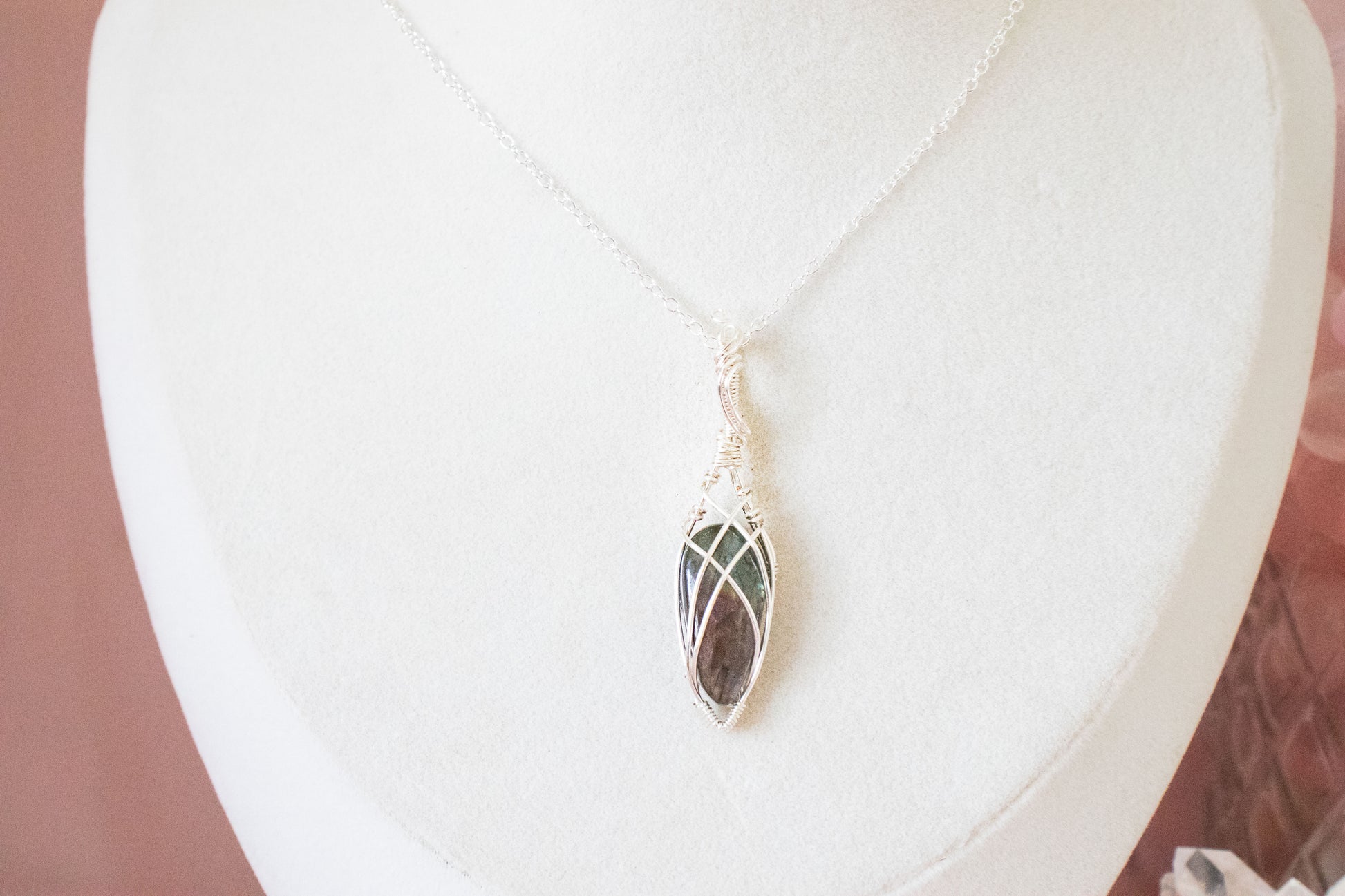 Made with silver-plated silver-colored copper wire, a pear labradorite stone, and 18" silver-colored chain.