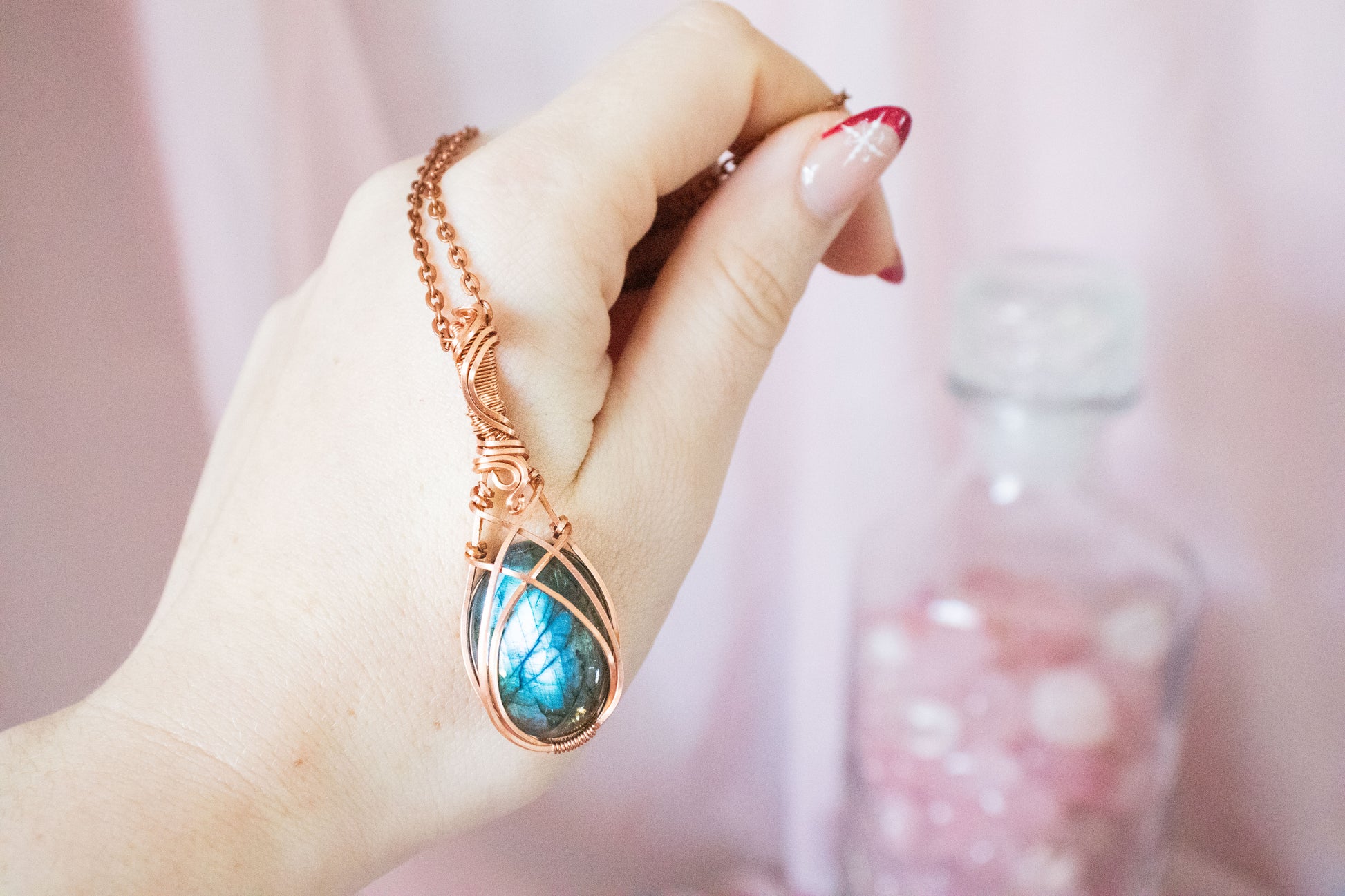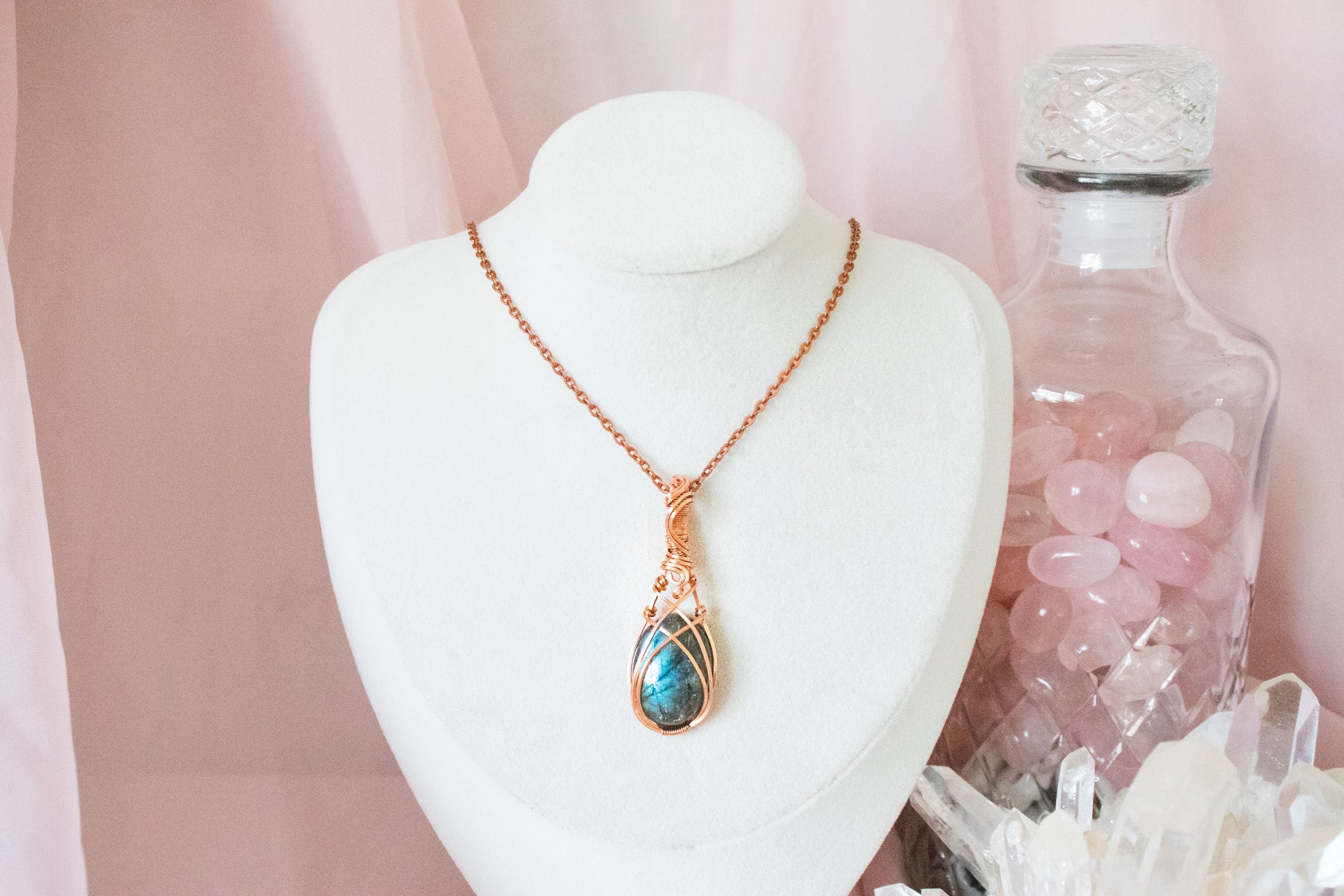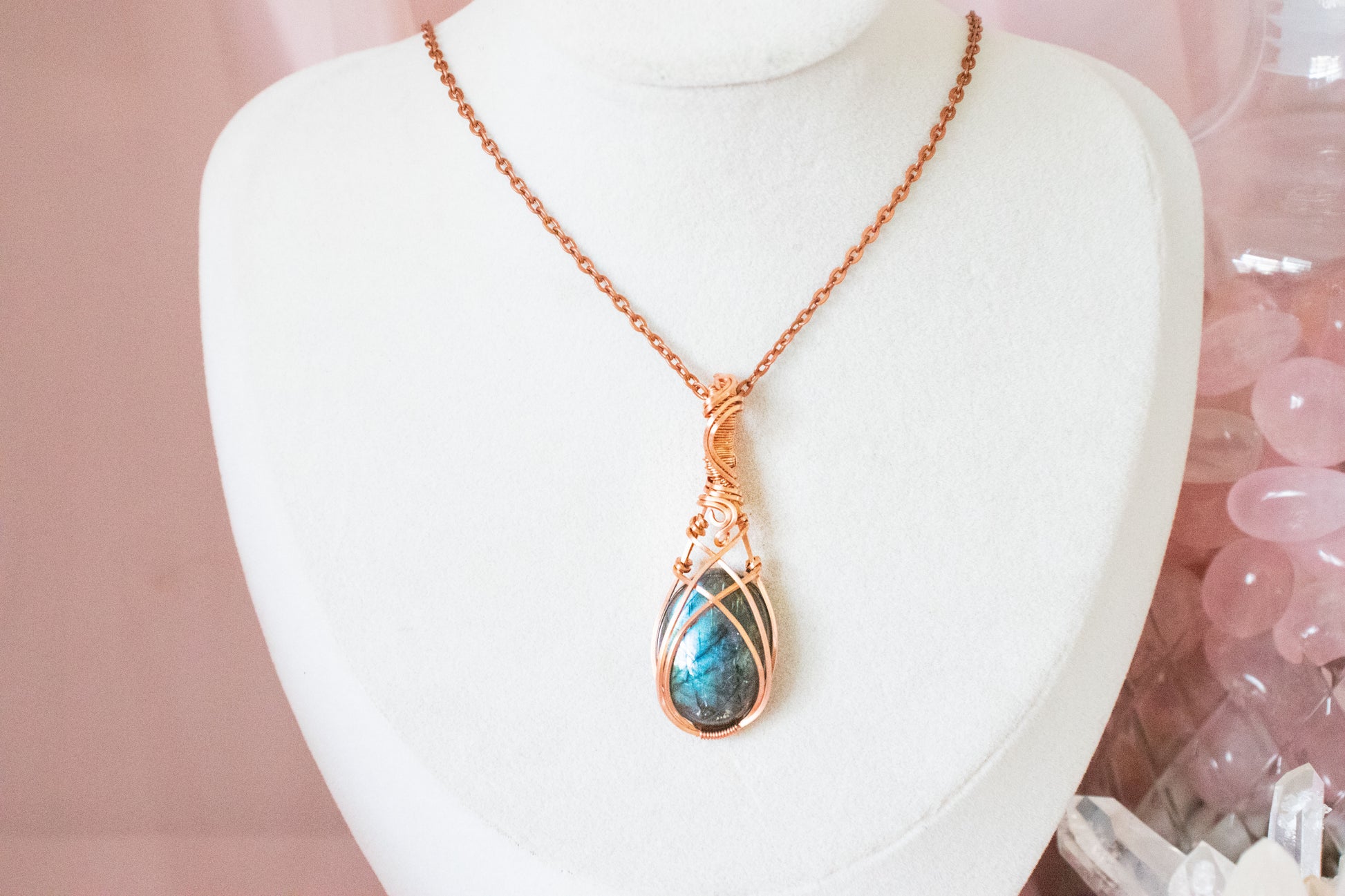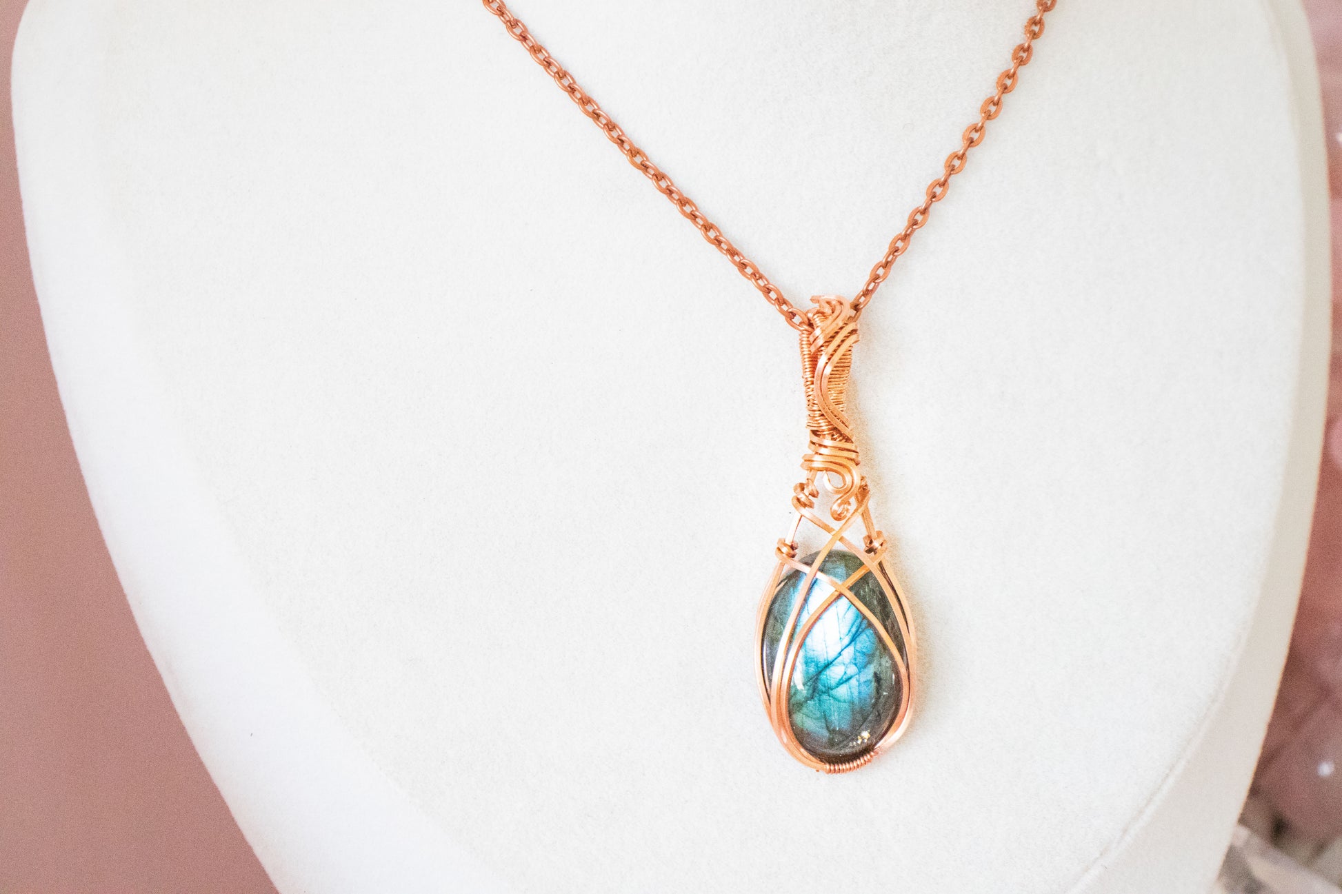 Made with tarnish resistant copper wire, an oval labradorite stone, and 18" copper-colored chain.