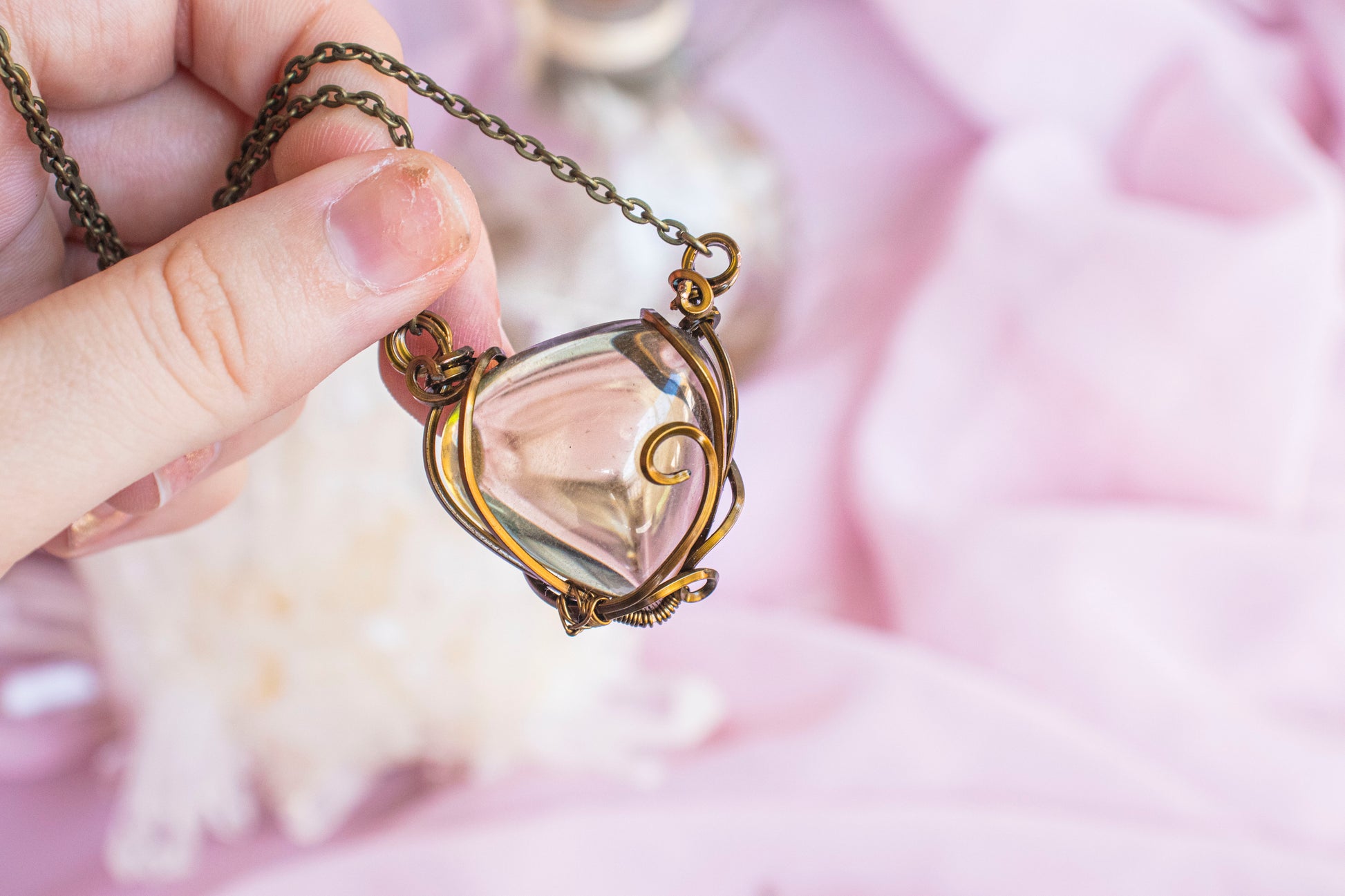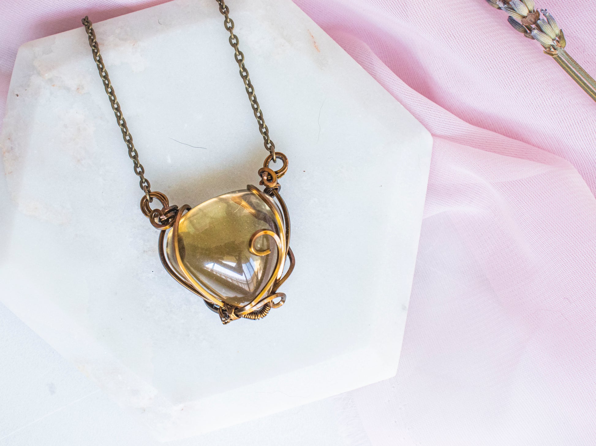 Pendants are made of raw copper or are copper-coated. Gold and silver colored jewelry are made with silver-plated wire.