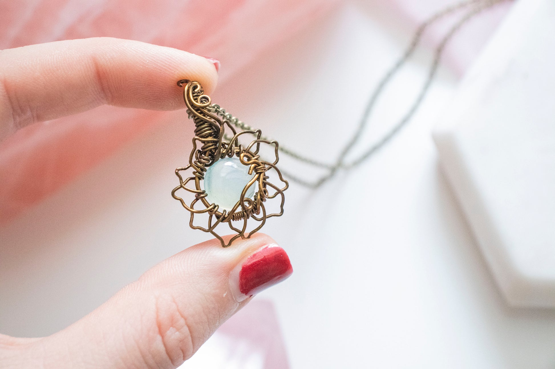 Pendants are made of raw copper or are copper-coated. Gold and silver colored jewelry are made with silver-plated wire.