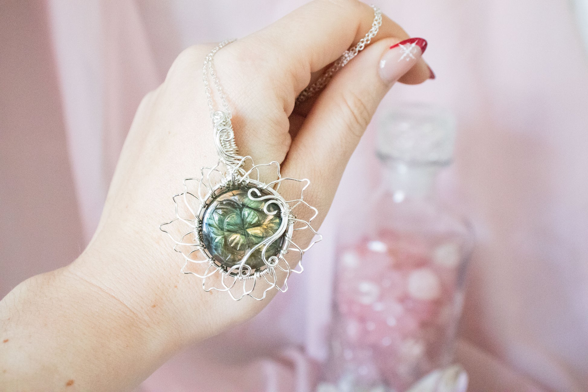 Made with silver-plated silver-colored copper wire, a round carved labradorite stone, and 20" silver-colored chain.