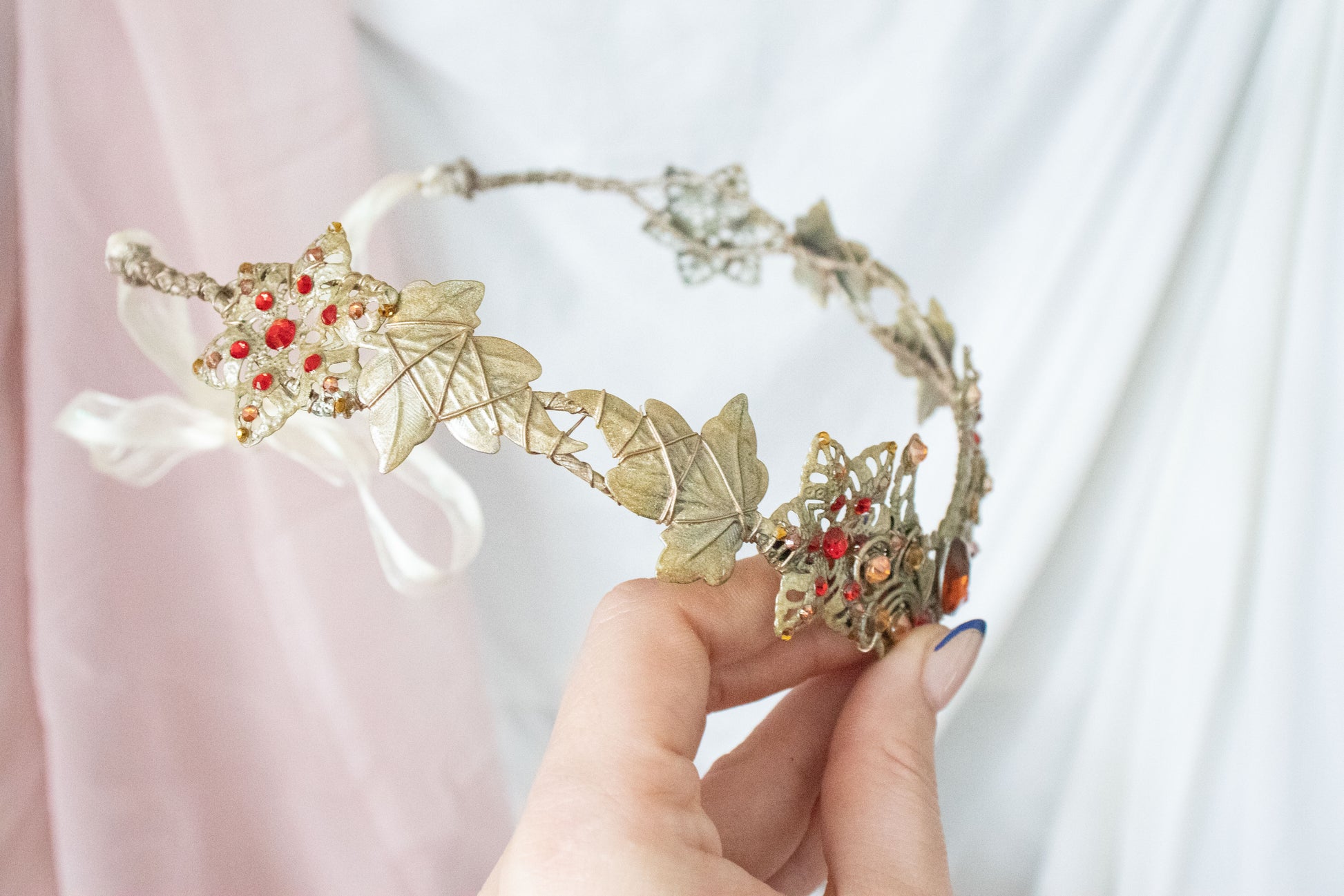 Embrace an elven-inspired elegance with our gold + autumn moon circlet tiara, designed to sit gracefully on the forehead. Each circlet is handcrafted with intricate detail to bring a mystical charm that elevates any outfit. Flexible and lightweight, it comfortably molds to your head, giving you the timeless beauty of fantasy realms with a real-world touch.