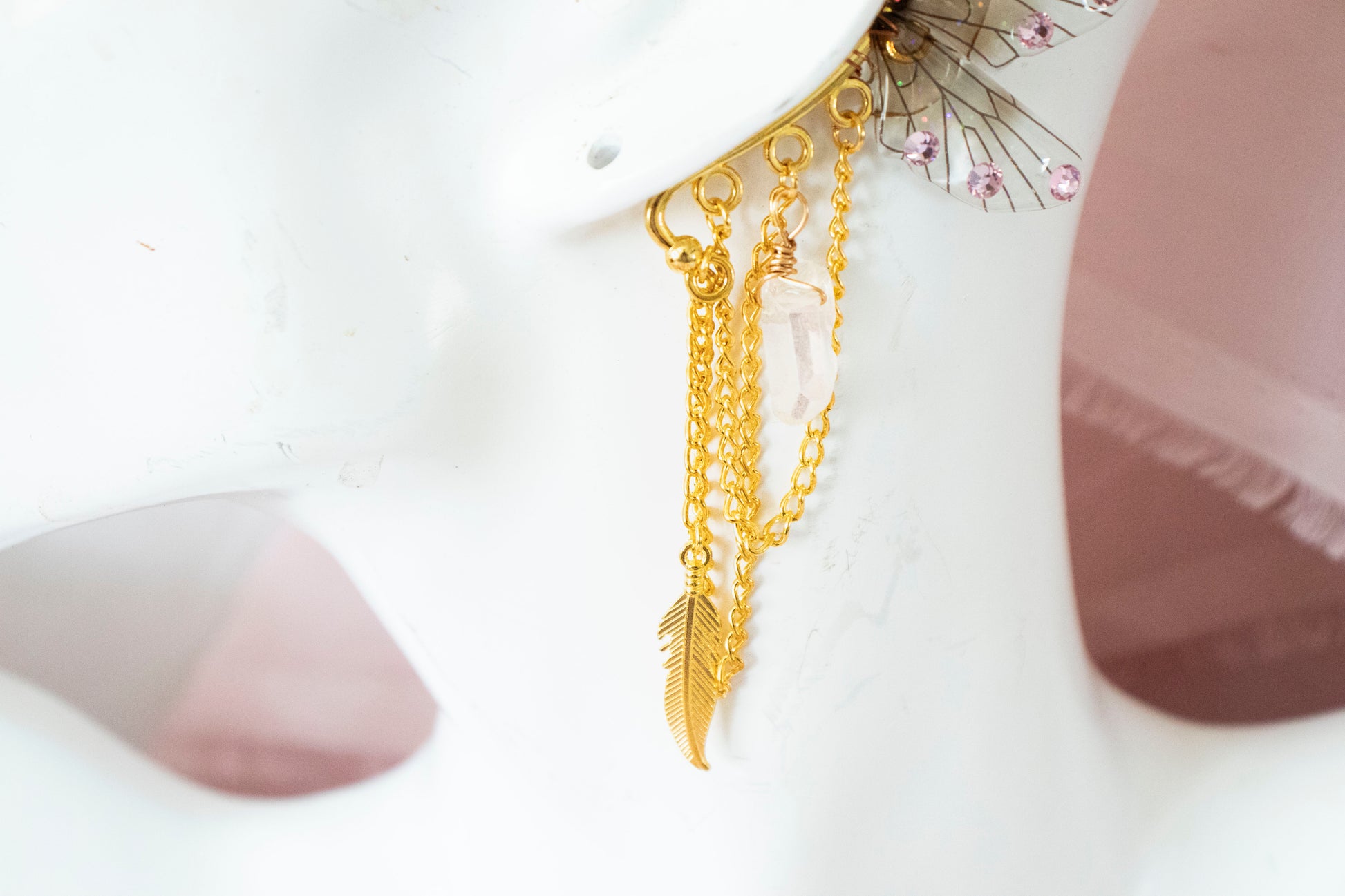 Ear cuffs feature brown fairy wings, gold chain, feather charms and clear aura crystals.