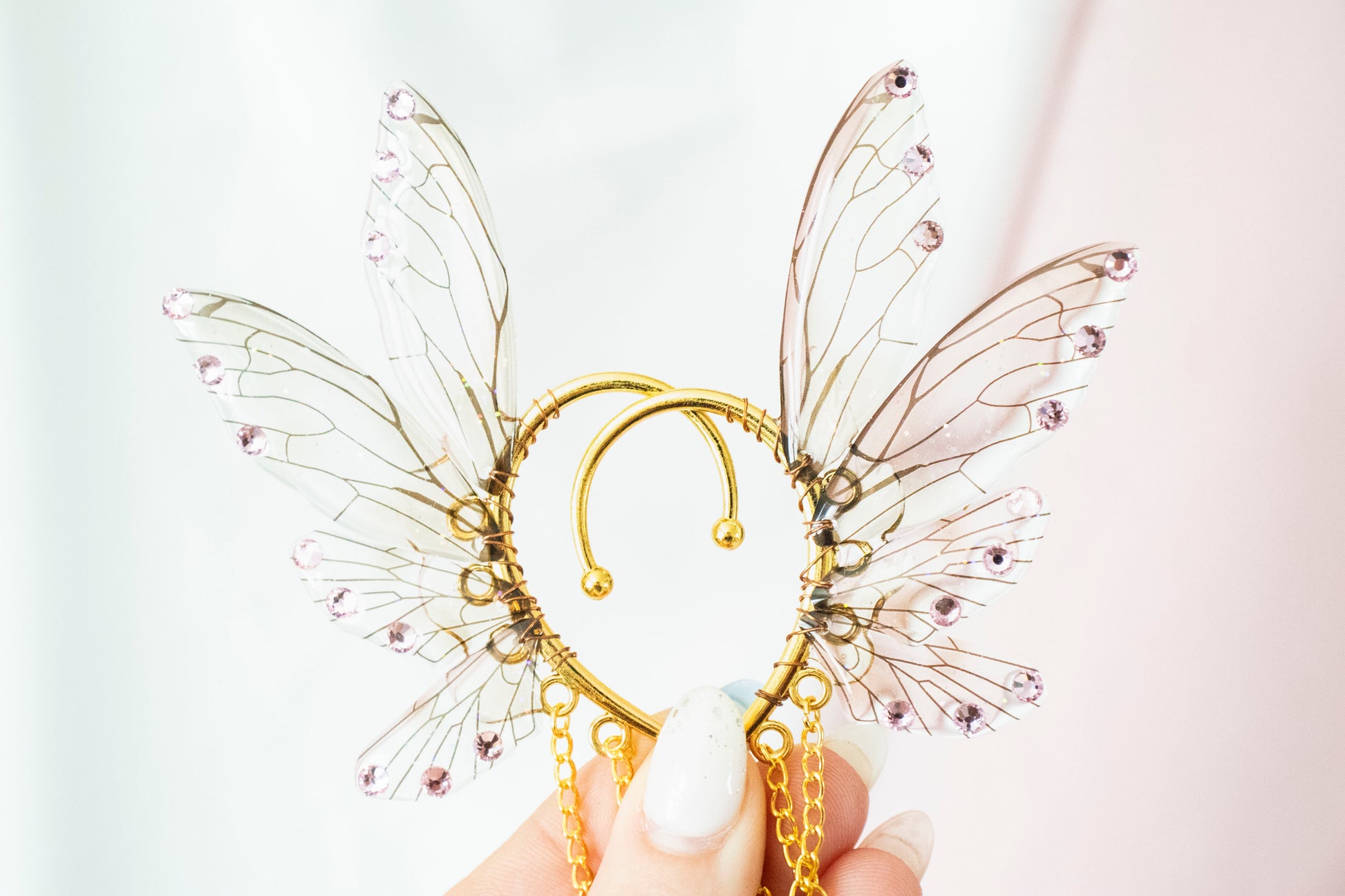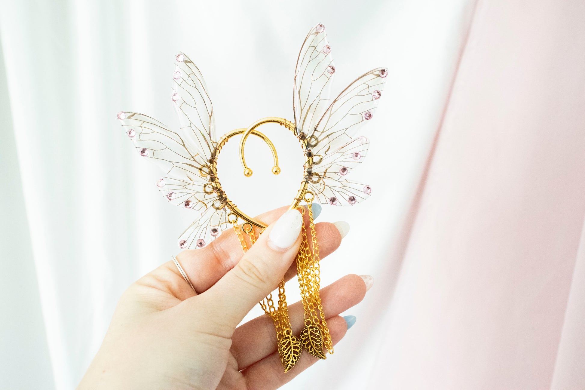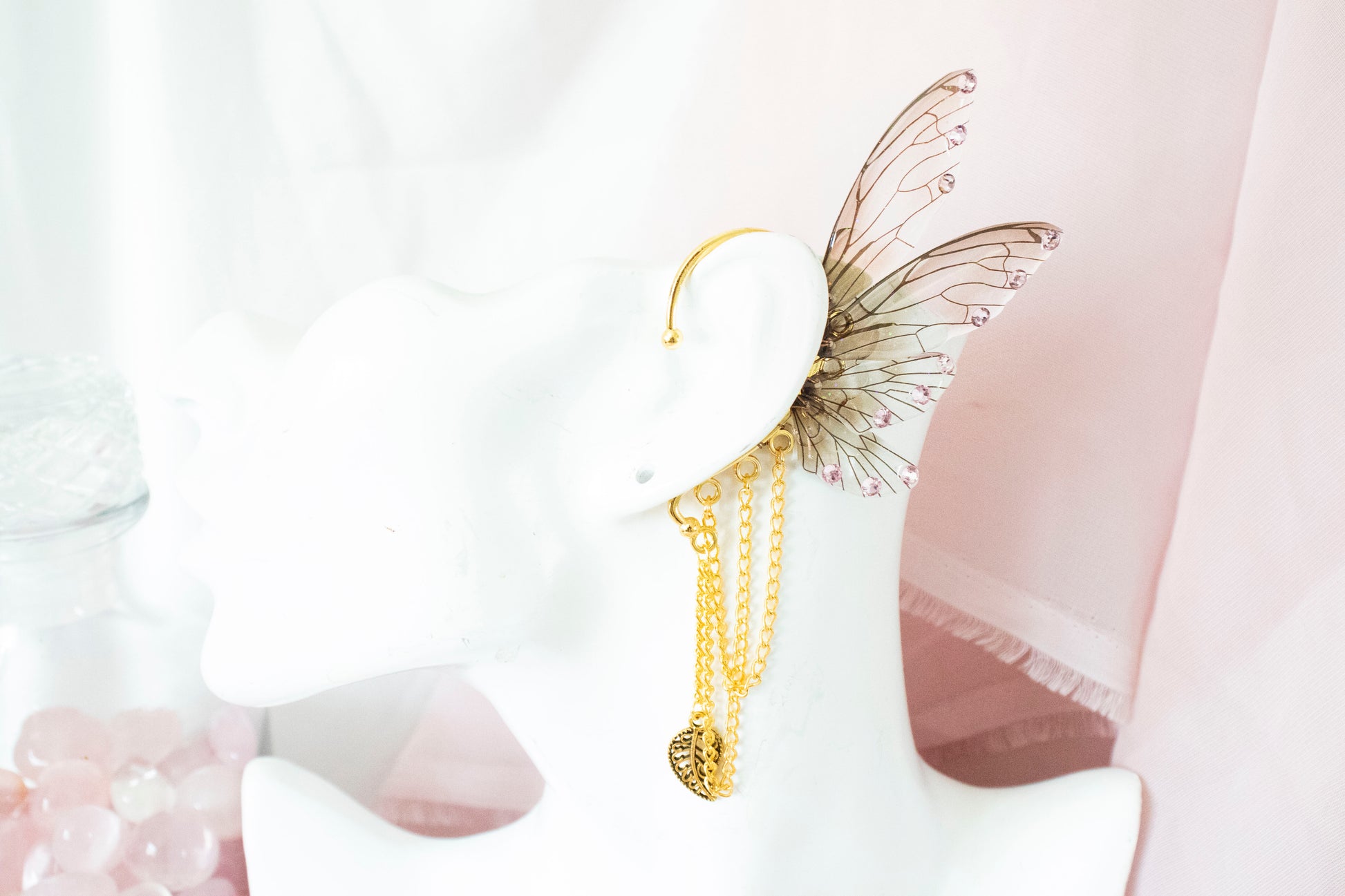 Ear cuffs feature brown fairy wings, gold chain, and leaf charms.