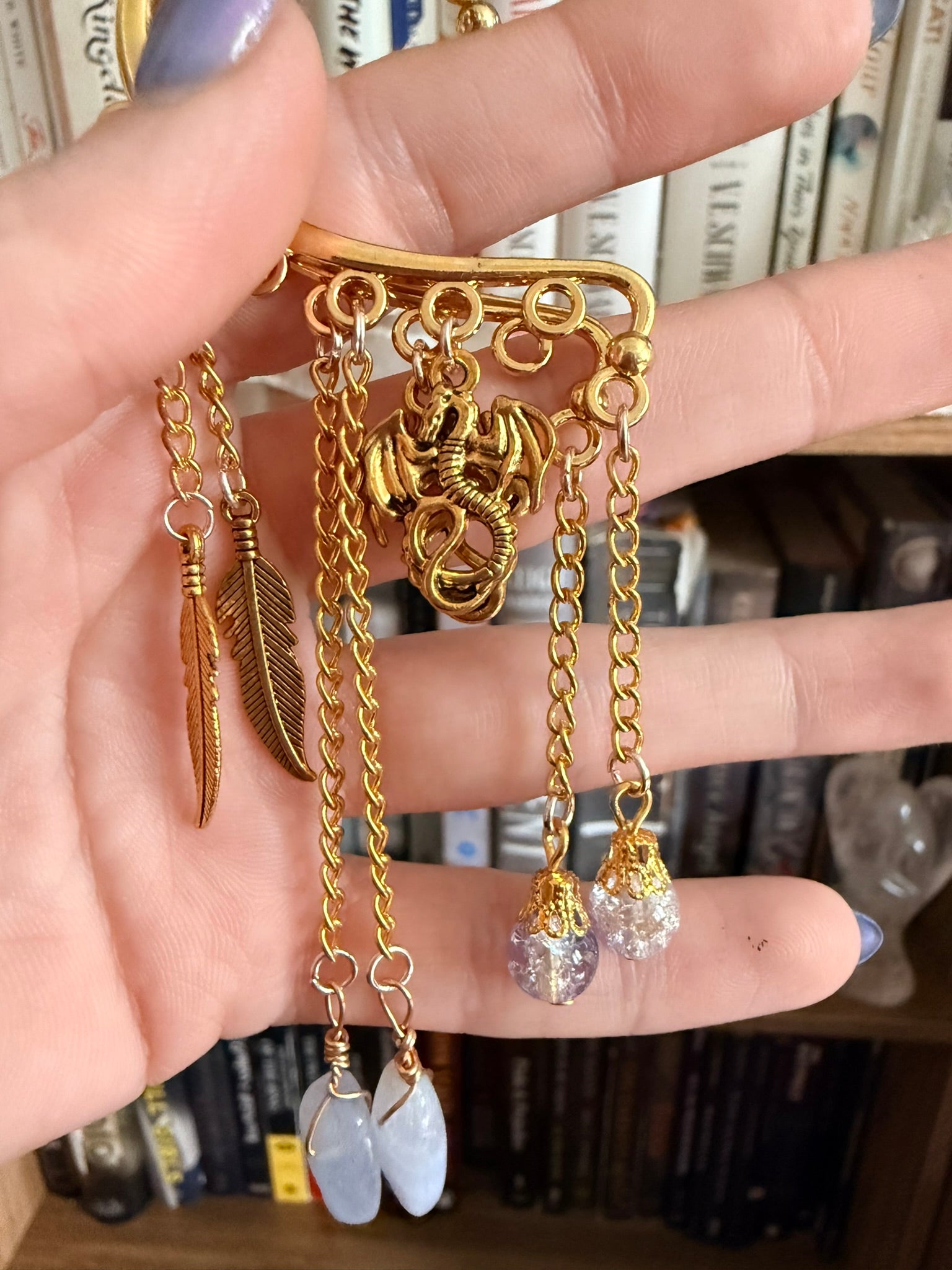Ear cuffs feature gold chain, feather charms, dragon charms, blue/clear crackle stone charms, and blue lace agate crystals.