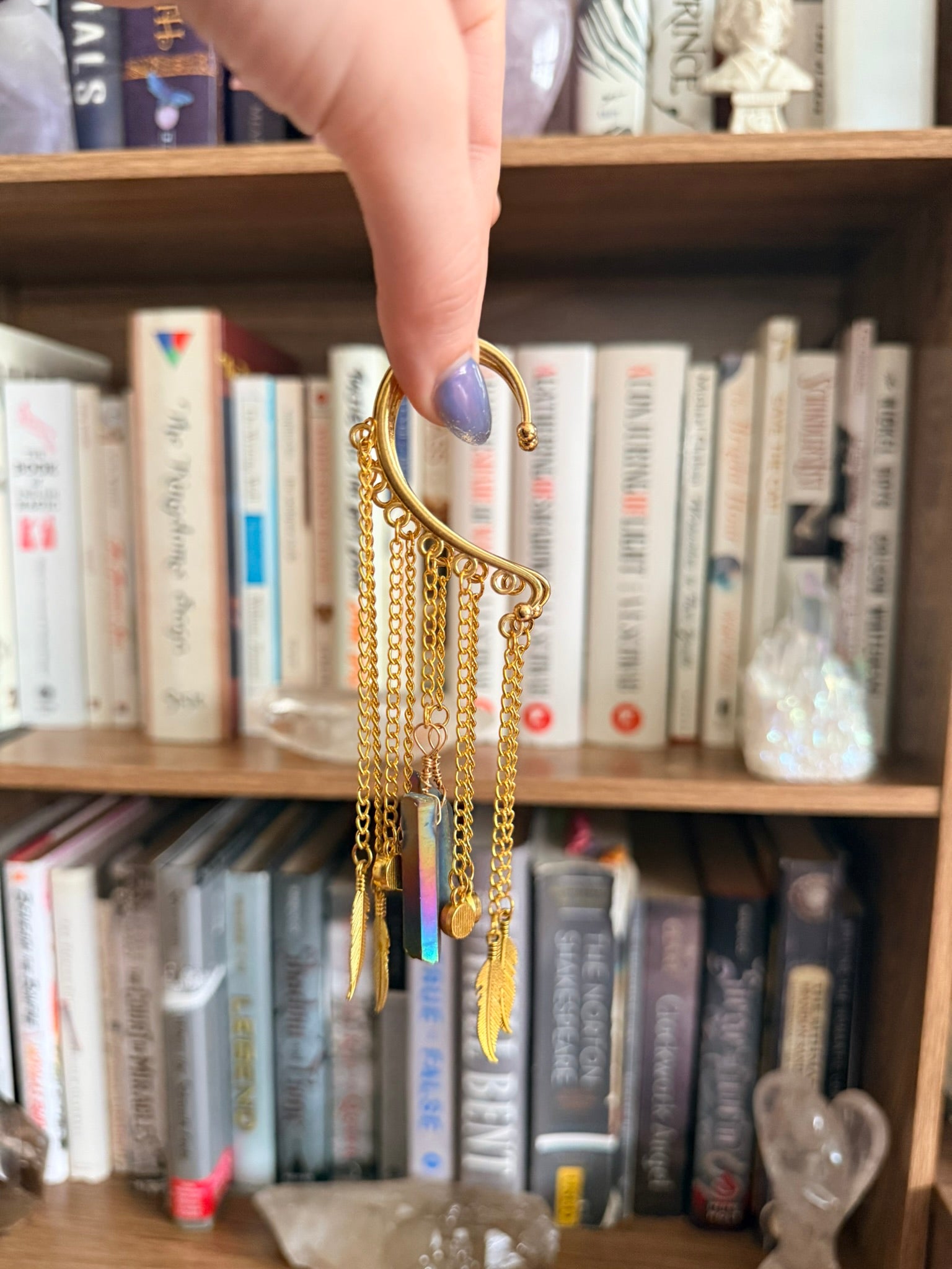 Ear cuffs feature gold chain, feather charms, purple rhinestone charms, and dark aura quartz crystals.