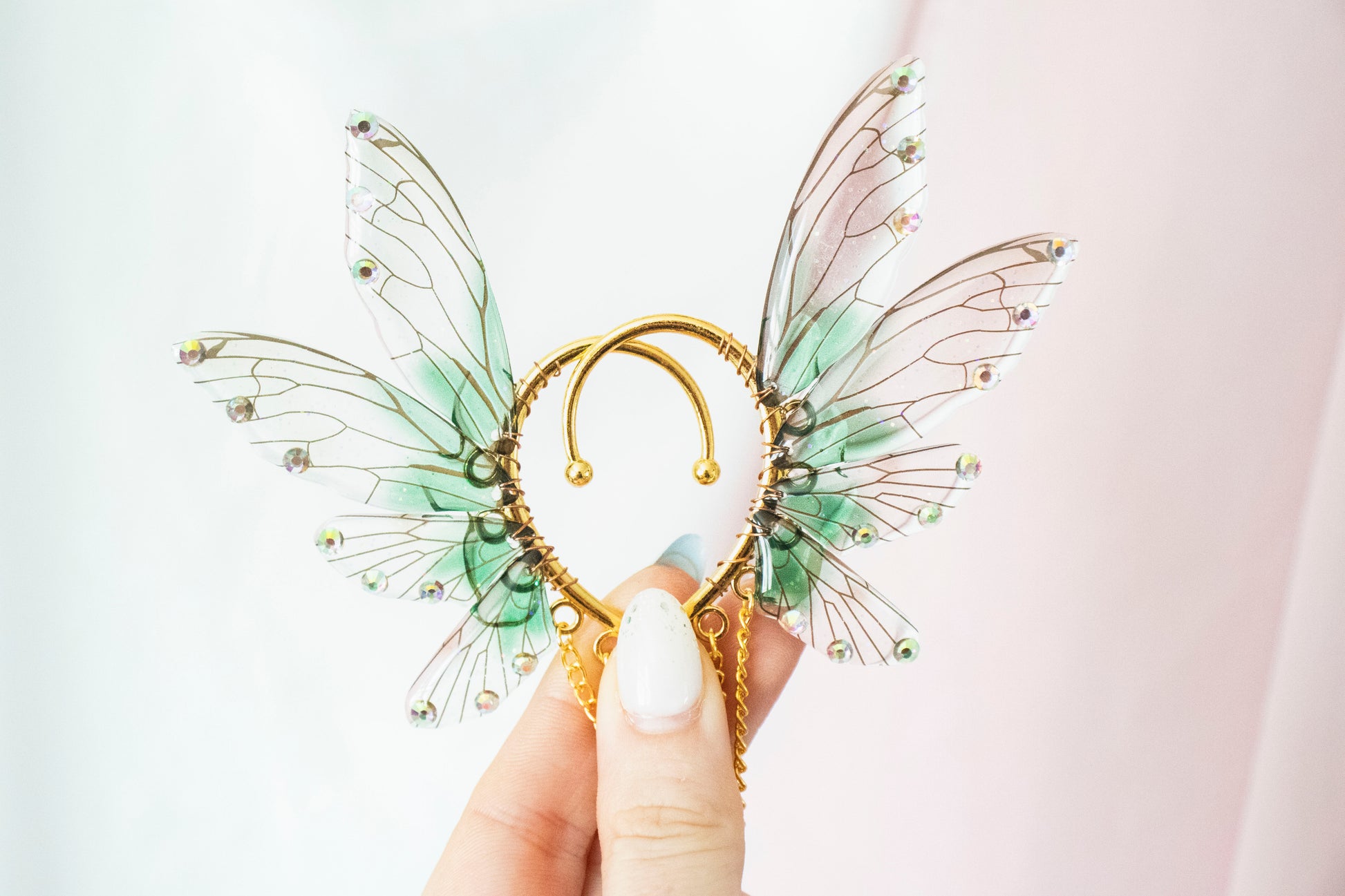 Ear cuffs feature brown fairy wings, gold chain, and dagger charms.