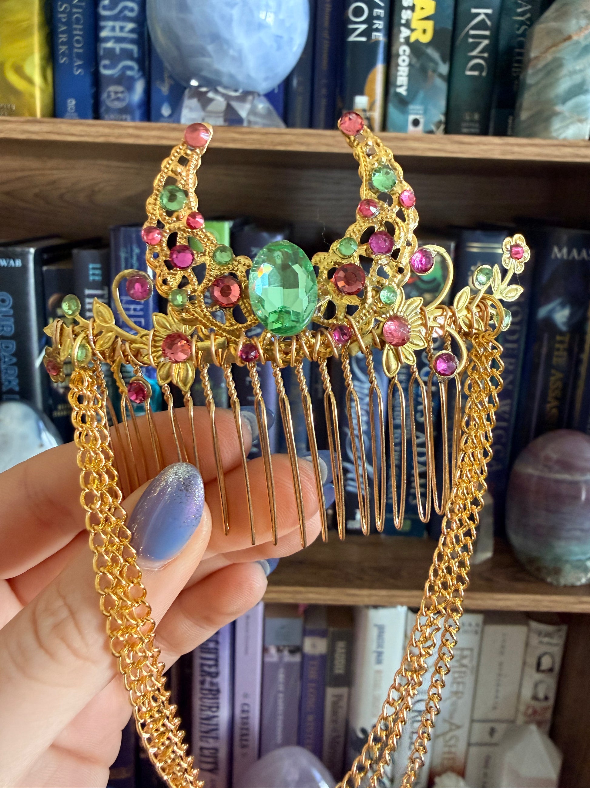 Add a touch of magic to your everyday look with our enchanting gold + kiwi hair comb—perfect for those who want a hint of elegance without committing to a full crown. Each piece is crafted on a 20-prong wire comb, designed to secure comfortably in hair of any length or thickness. Every comb is unique and handmade, blending beauty with versatility for a truly special accessory that complements any style.