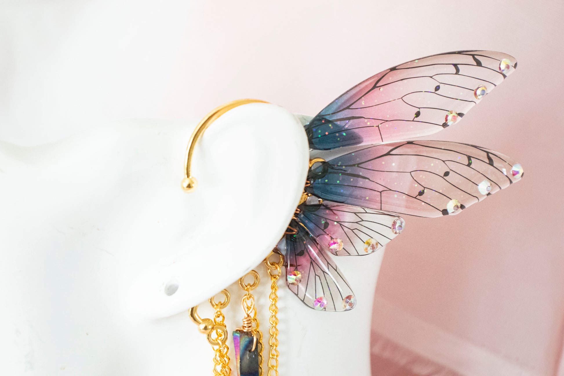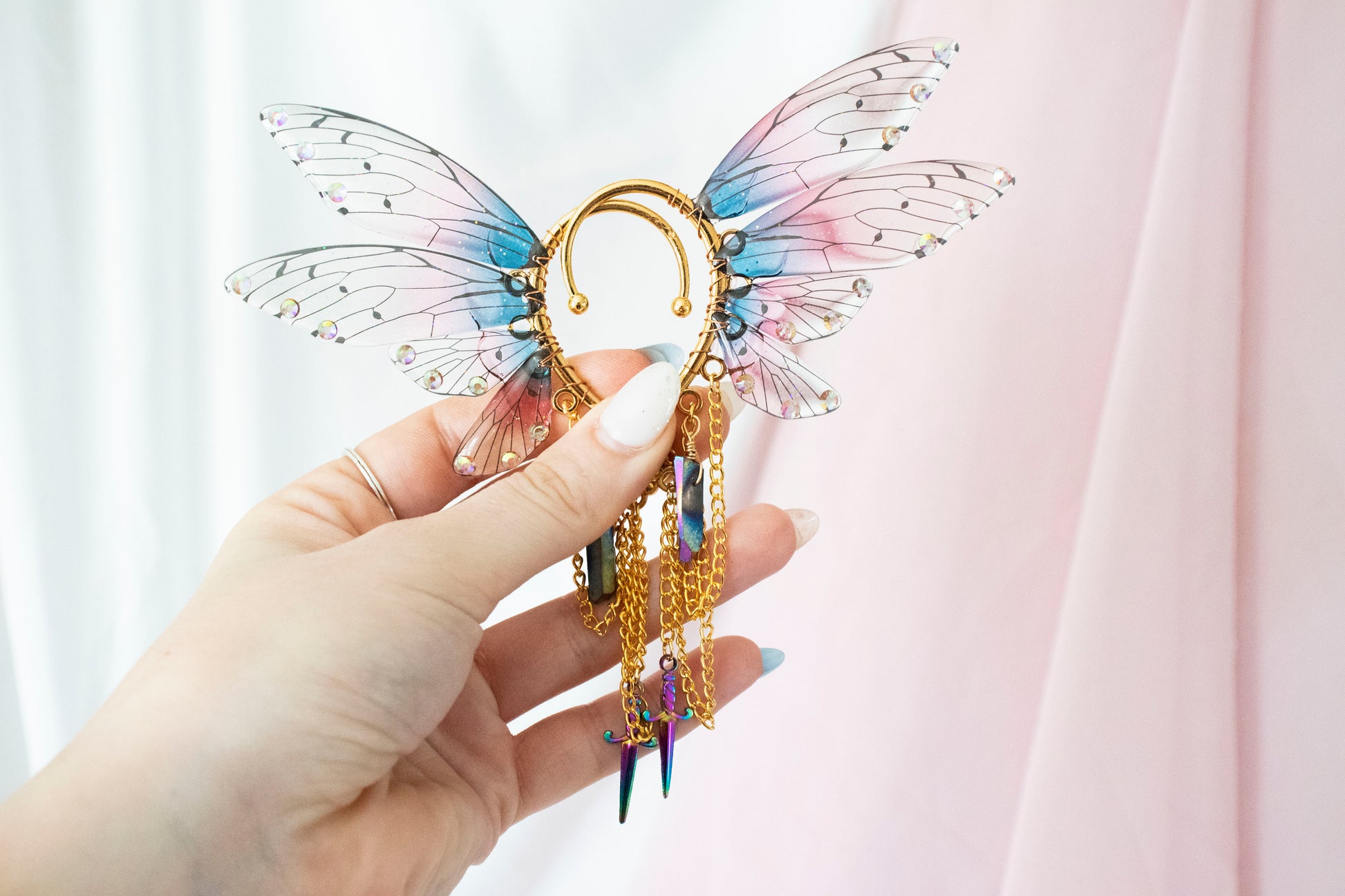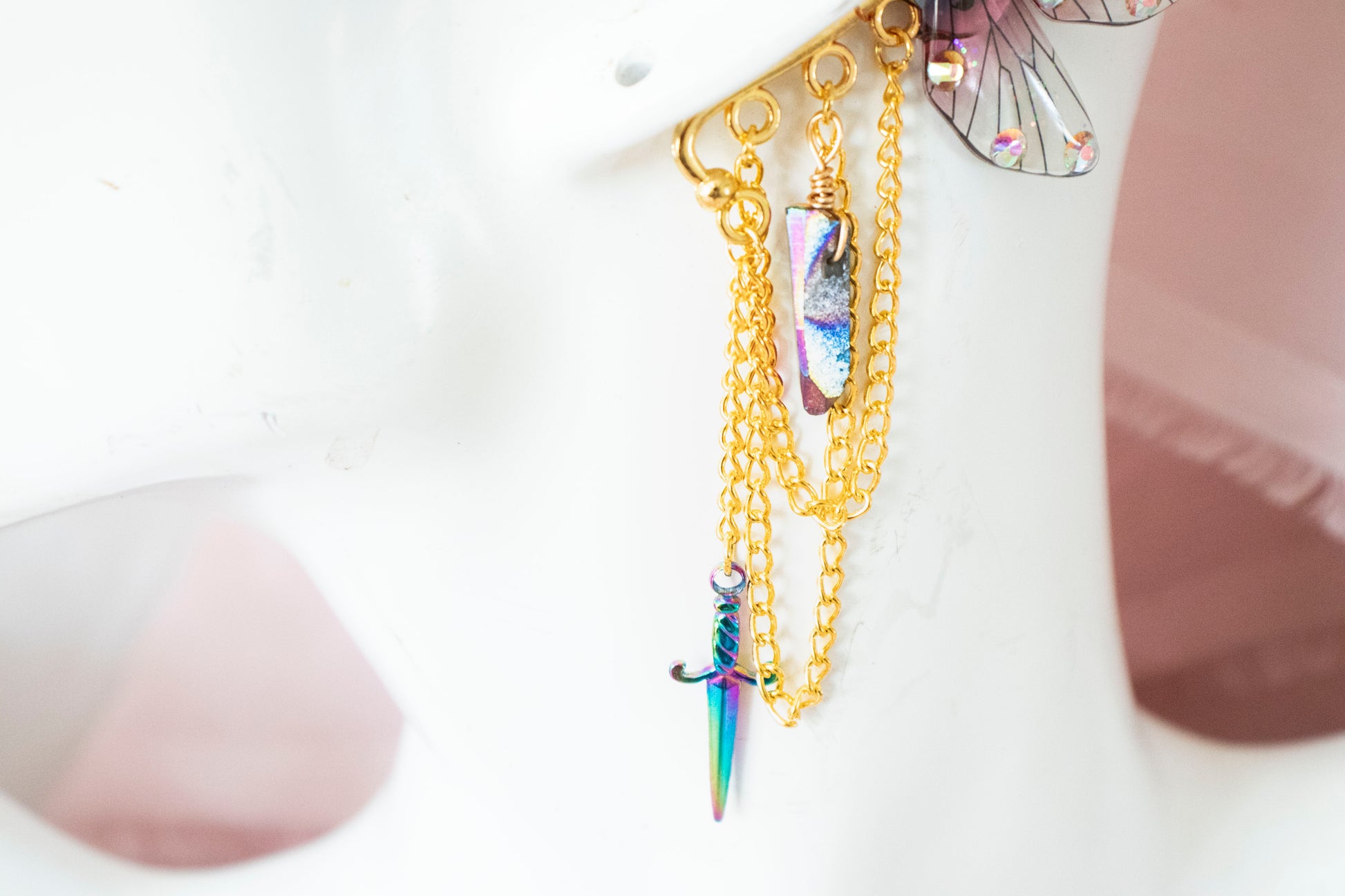 Ear cuffs feature pink/blue gradient fairy wings, gold chain, rainbow aura crystals, and dagger charms.