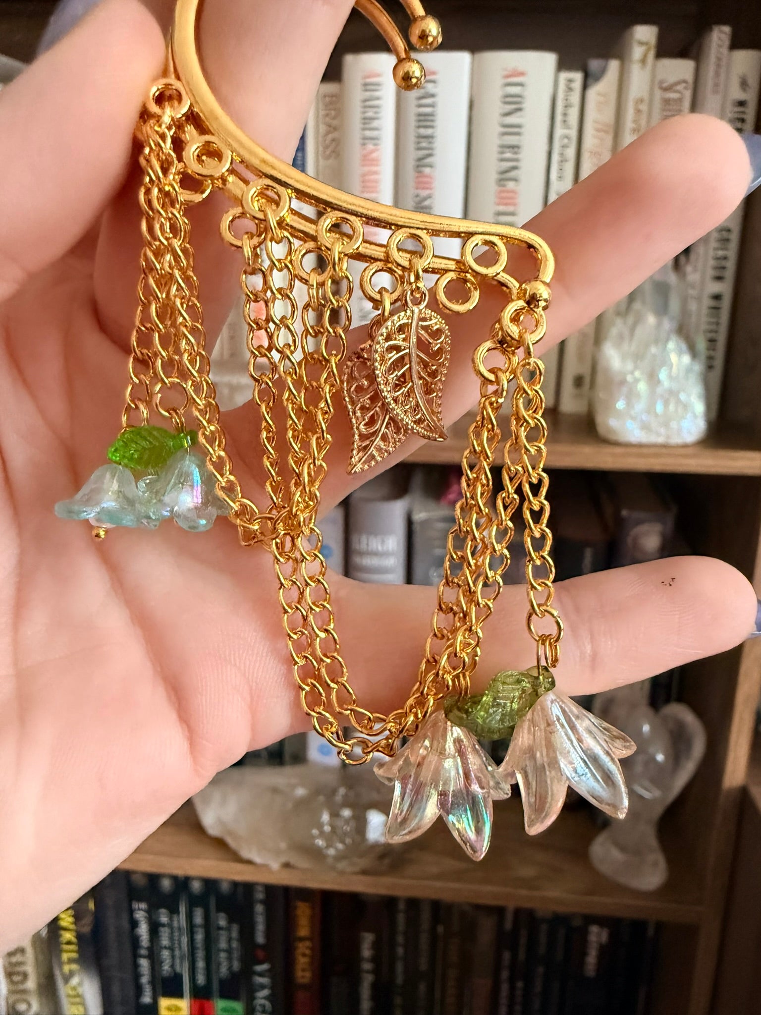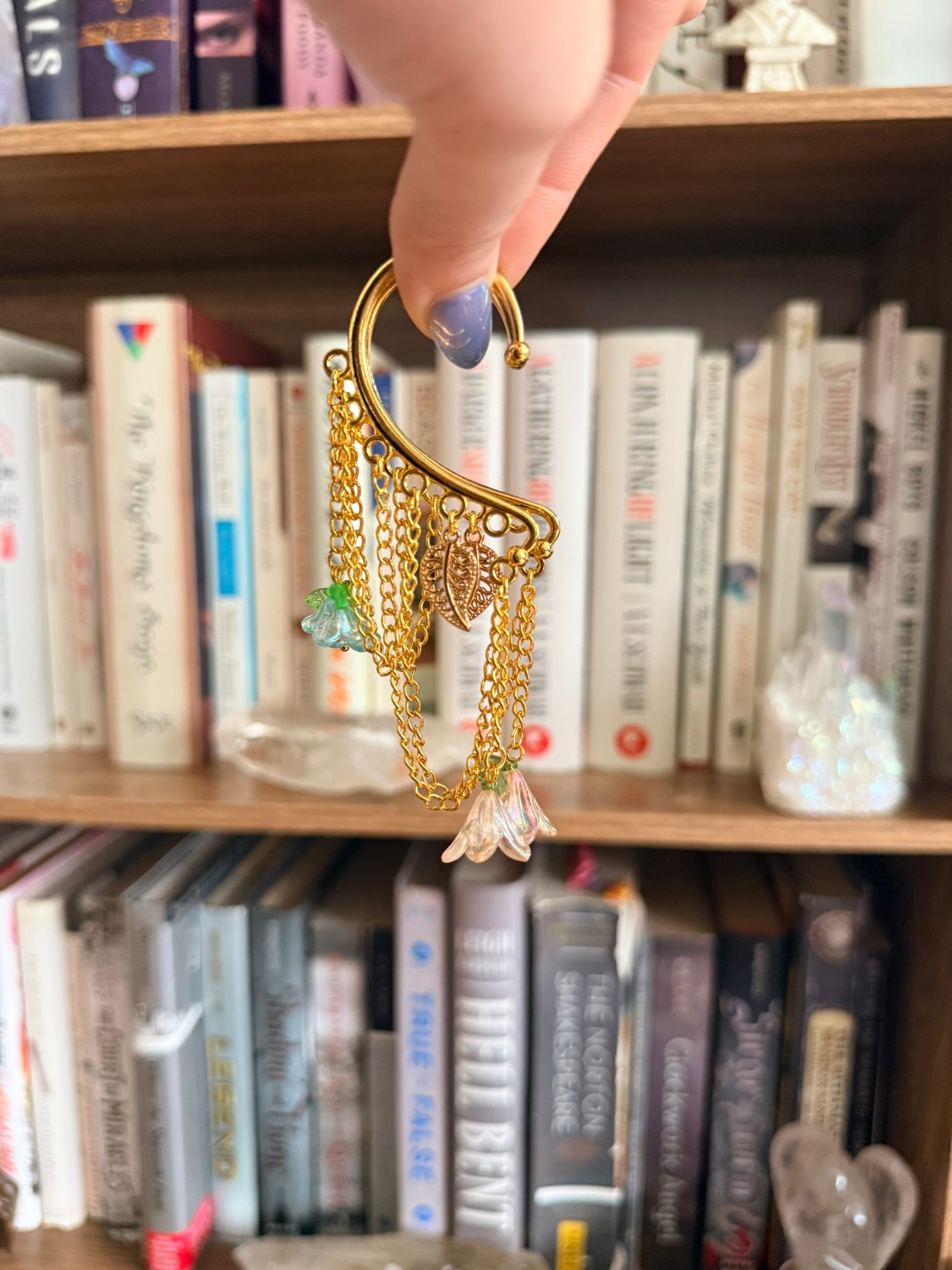 Ear cuffs feature gold chain, large pink flower charms, small teal flower charms, and leaf charms.