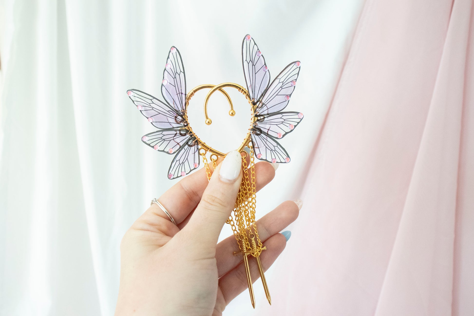Ear cuffs feature purple fairy wings, gold chain, and sword charms.