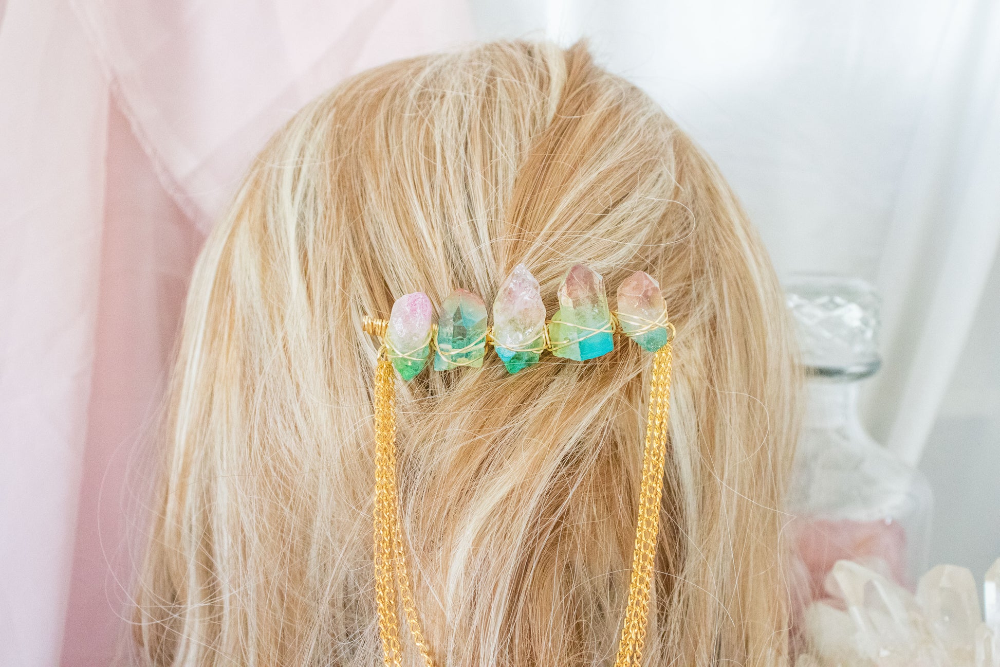 Infuse your everyday style with a touch of magic using our Gold + Rainbow Crystal Hair Comb. Crafted with vibrant colored quartz, these combs bring the energy and beauty of crystals to any hairstyle. Designed with 10-prong wire combs, they are suitable for all hair lengths and thicknesses, ensuring a secure yet comfortable fit. Handmade with care, each comb is truly one of a kind—perfect for adding subtle sparkle without committing to a full crown.