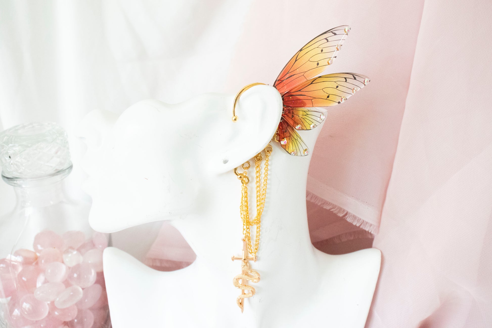 Ear cuffs feature sunset fairy wings, gold chain, and snake charms.