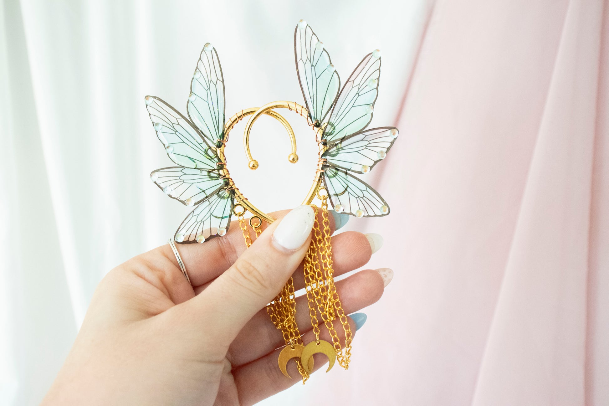 Ear cuffs feature teal fairy wings, gold chain, and moon charms.