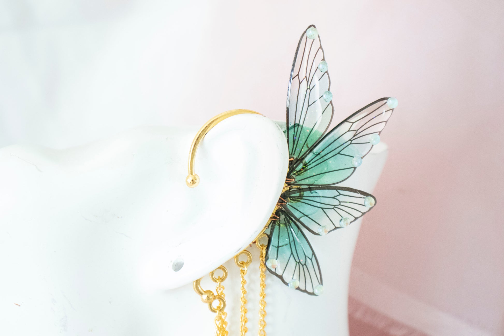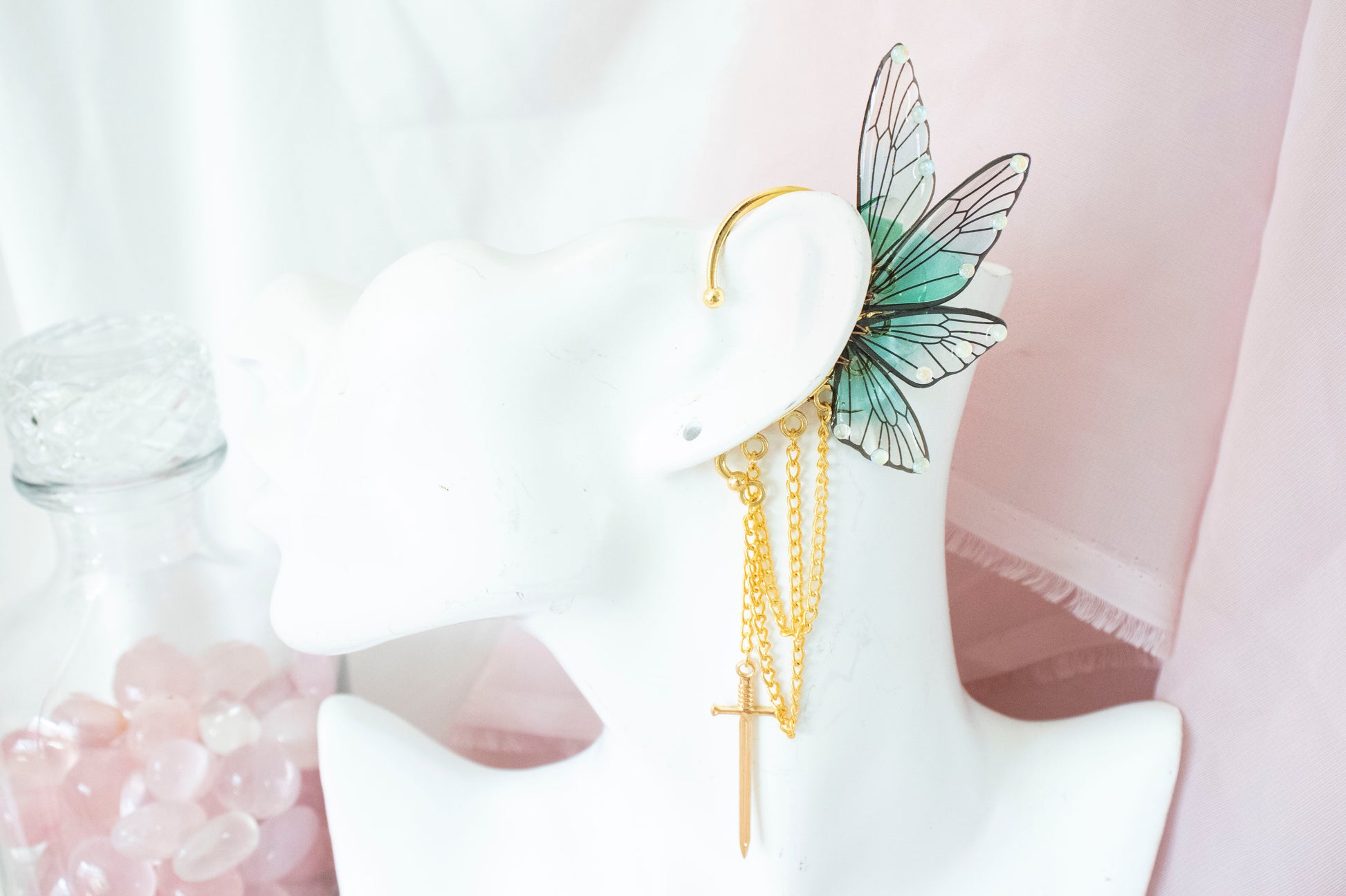 Ear cuffs feature teal fairy wings, gold chain, and sword charms.