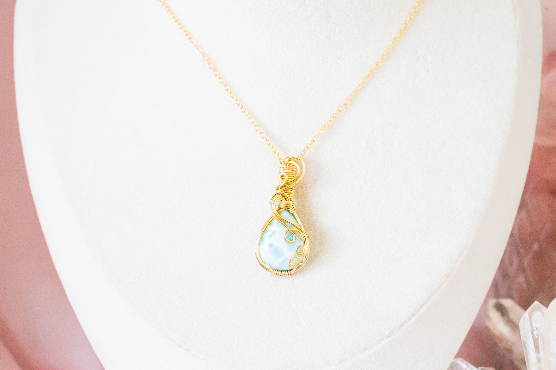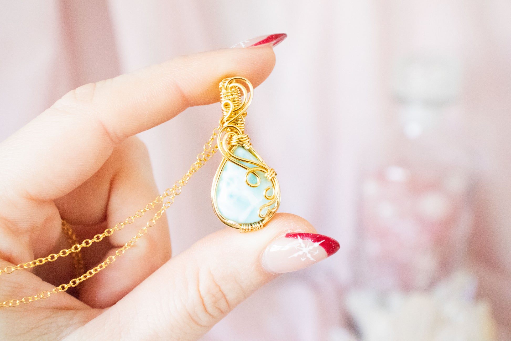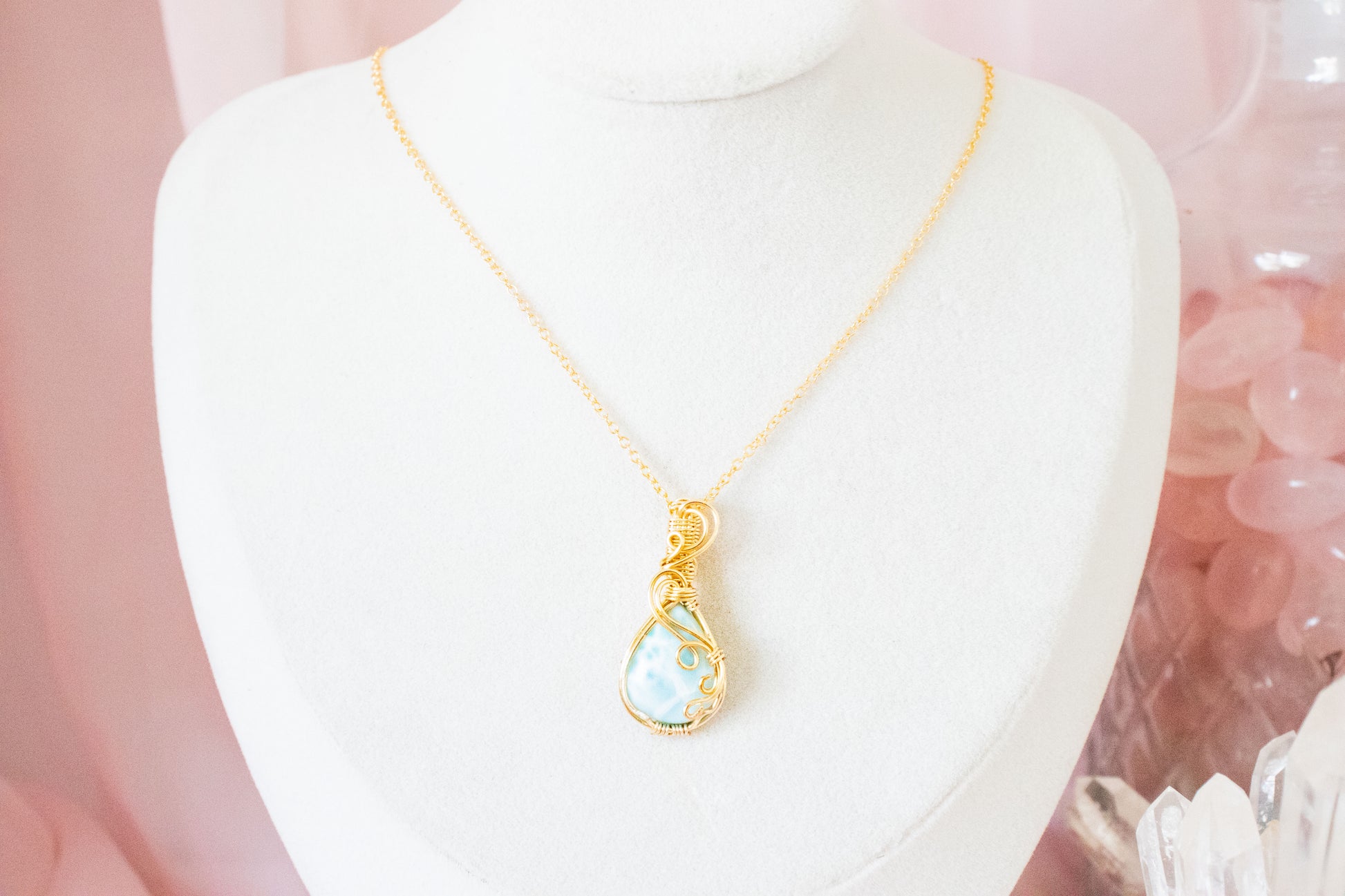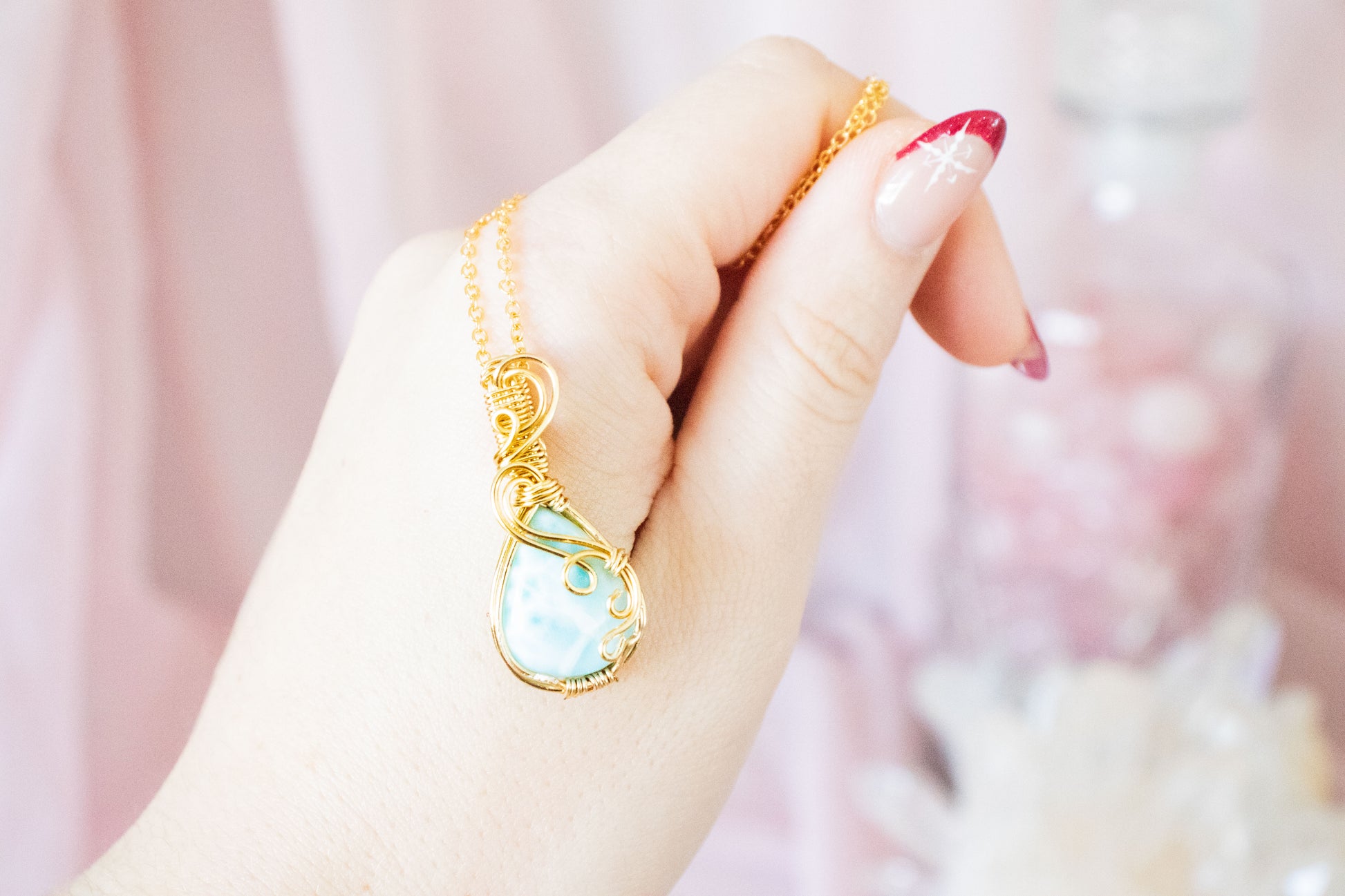 Made with silver-plated gold-colored wire, a pear larimar stone, and 18" gold-colored chain.