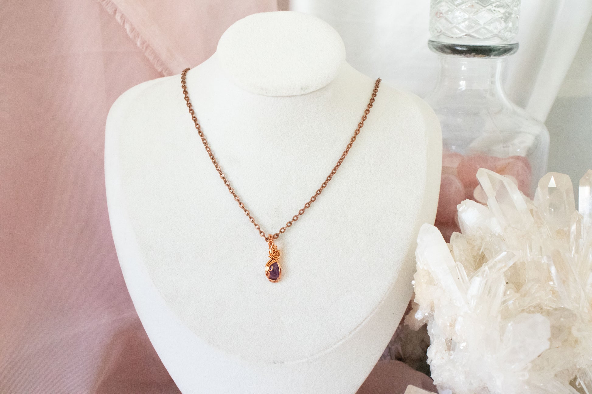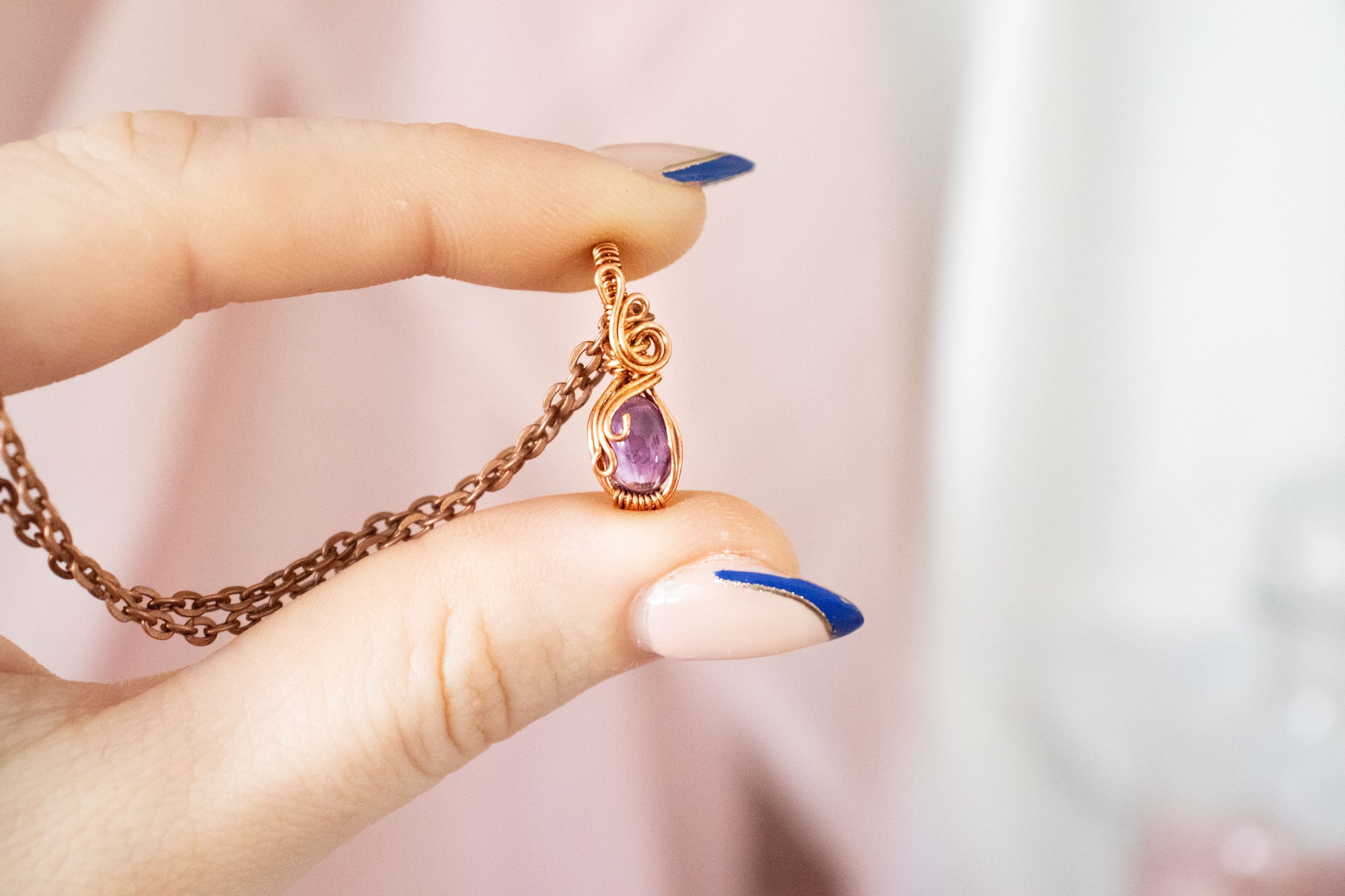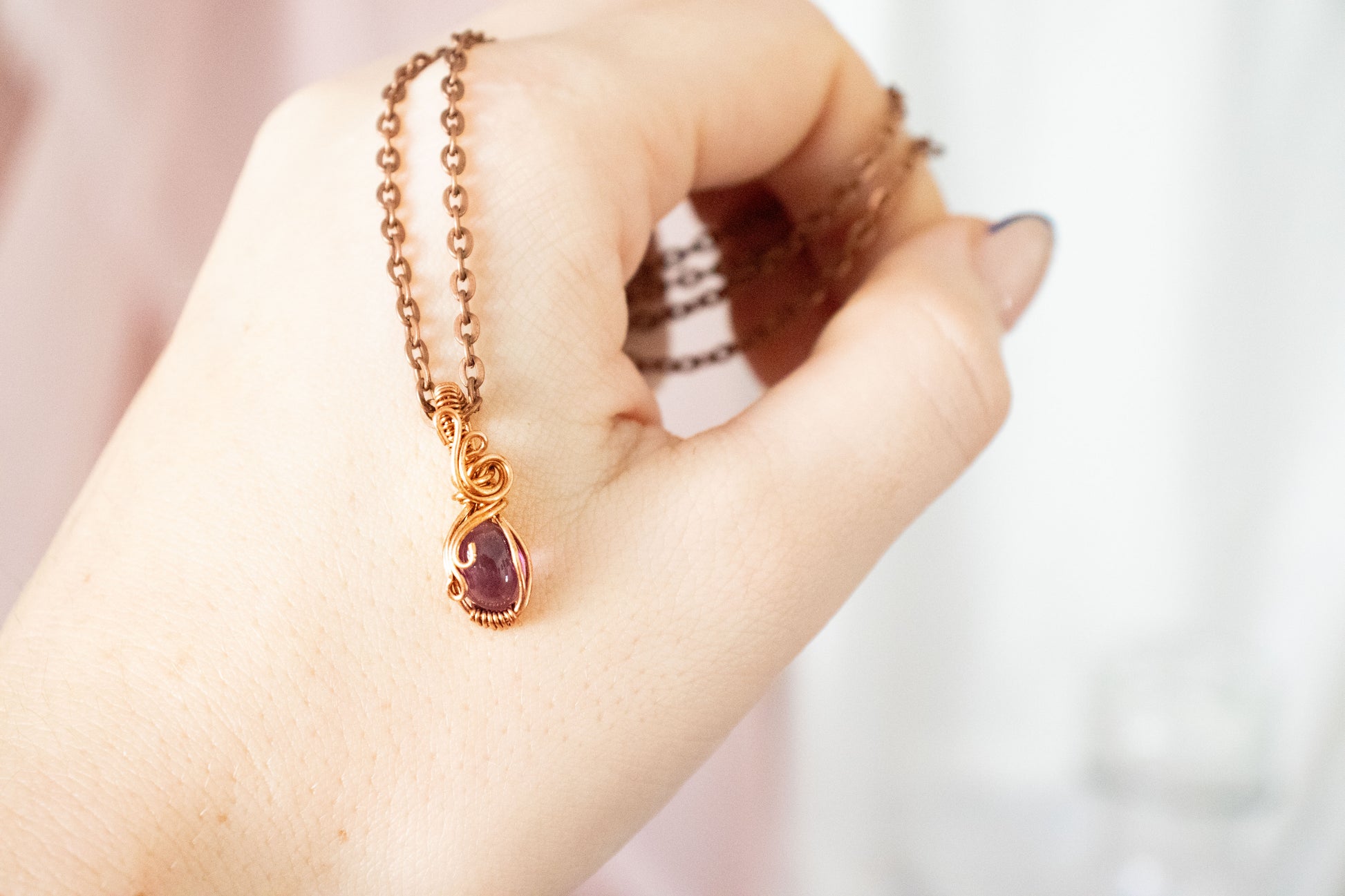Made with tarnish-resistant copper wire, an oval amethyst stone, and 18" copper-colored chain.