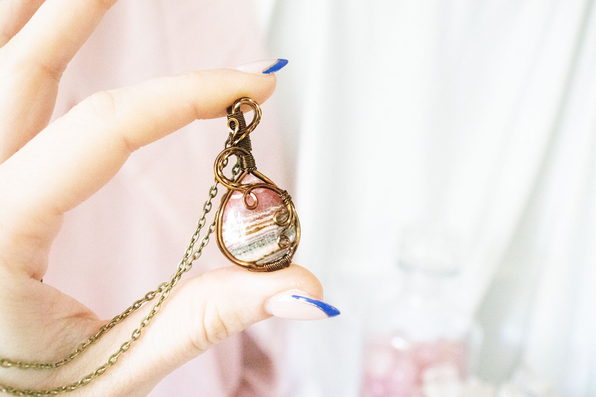 Made with bronze-colored copper wire, a pear rhodochrosite stone, and 18" bronze-colored chain.