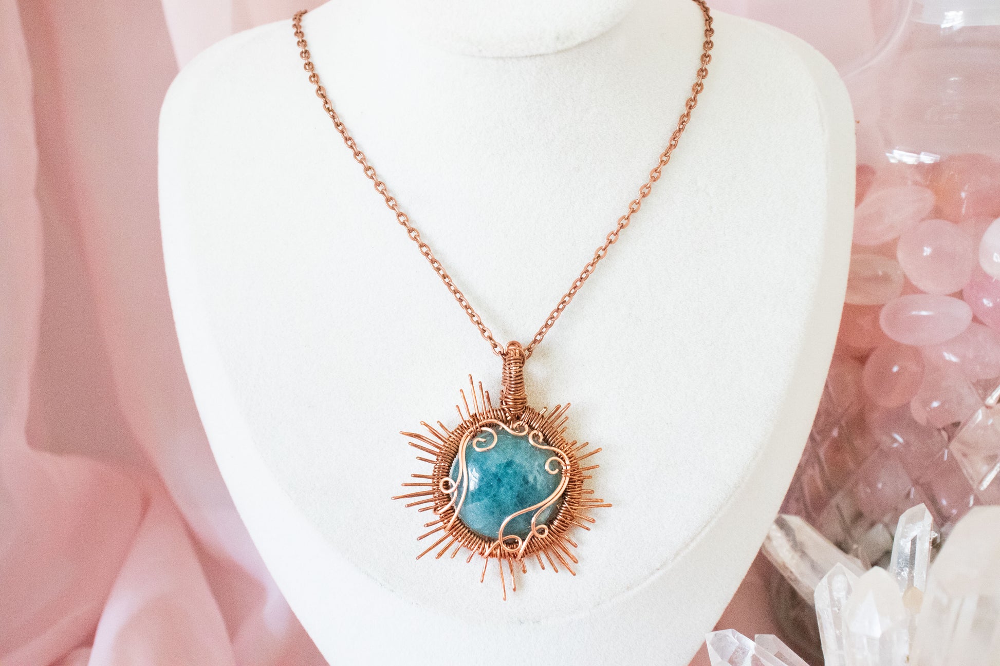 Made with tarnish resistant copper wire, a round aquamarine stone, and 20" copper-colored chain.