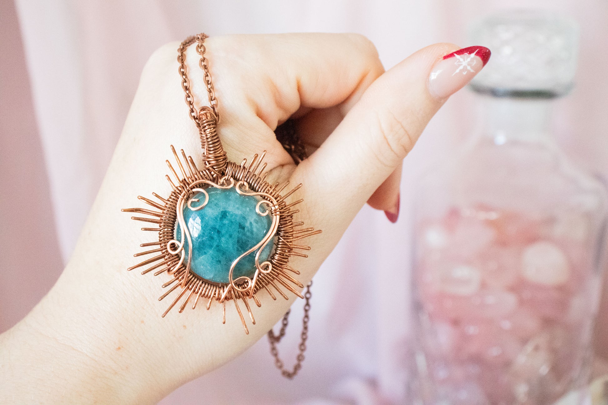Pendants are made of raw copper or are copper-coated. Gold and silver colored jewelry are made with silver-plated wire.