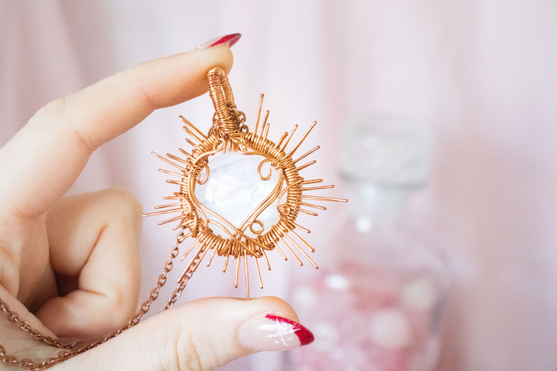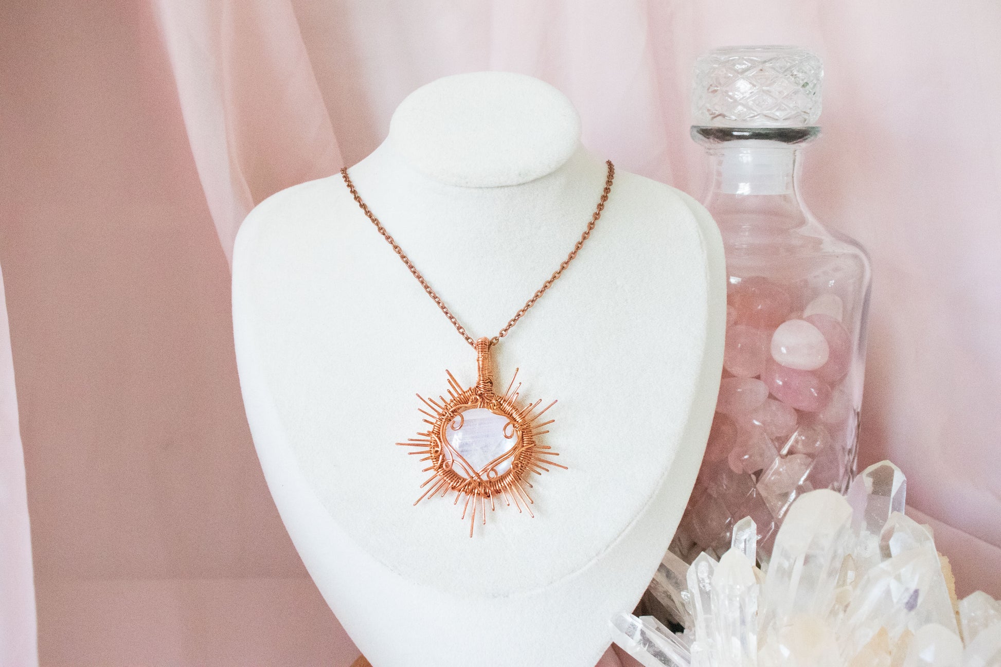 Made with tarnish resistant copper wire, a round moonstone stone, and 20" copper-colored chain.