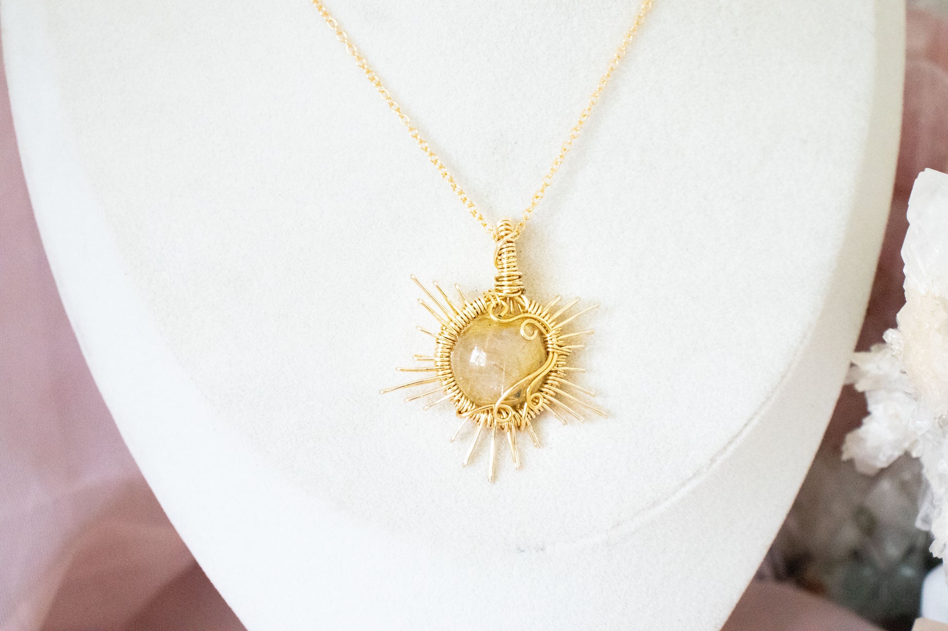 Made with silver-plated gold-colored copper wire, a round rutilated quartz stone, and 18" gold-colored chain.