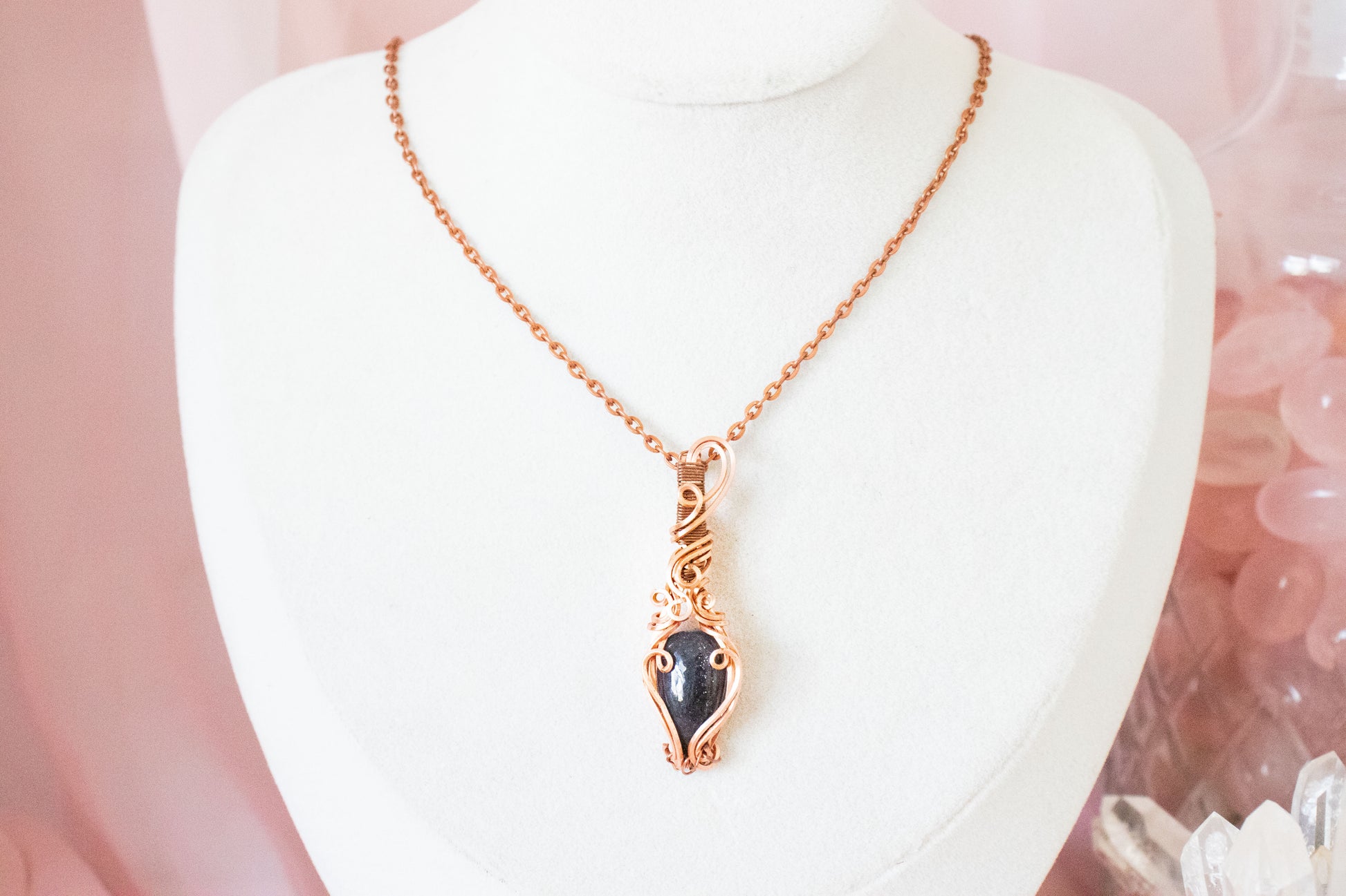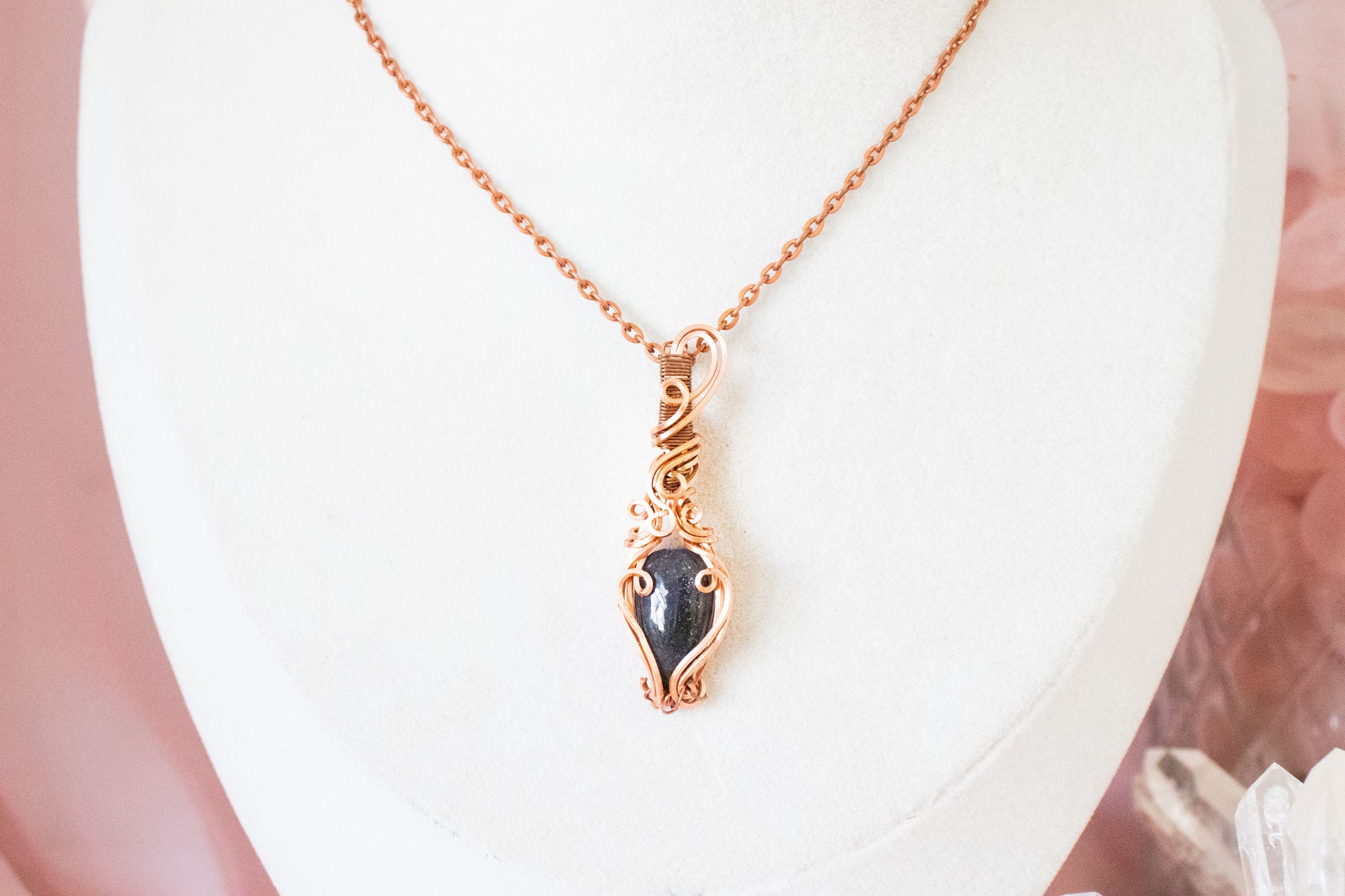 Made with tarnish resistant copper wire, a pear iolite stone, and 18" copper-colored chain.
