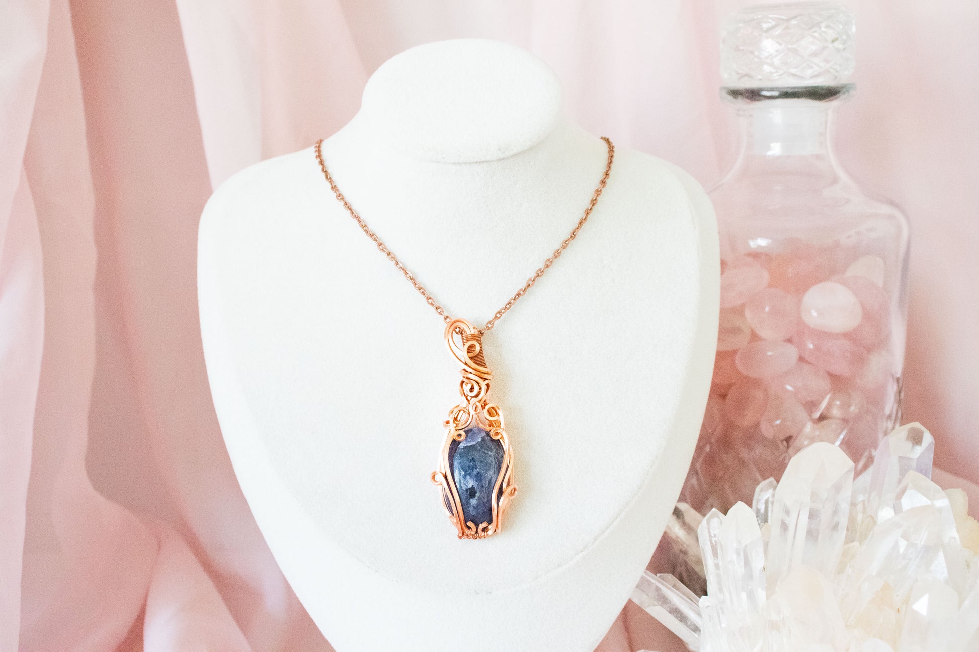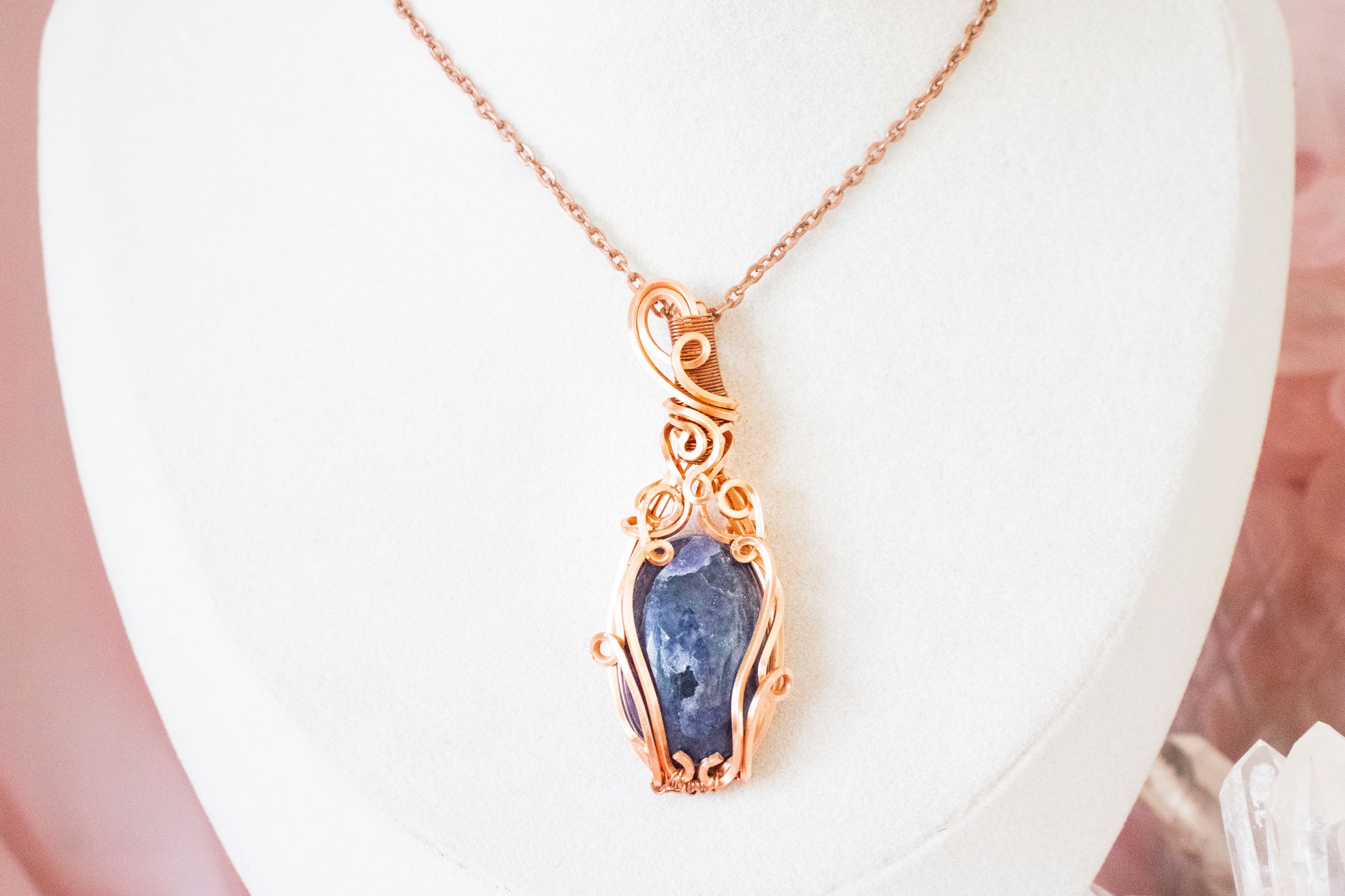 Made with tarnish resistant copper wire, an oval stone, and 20" copper-colored chain.