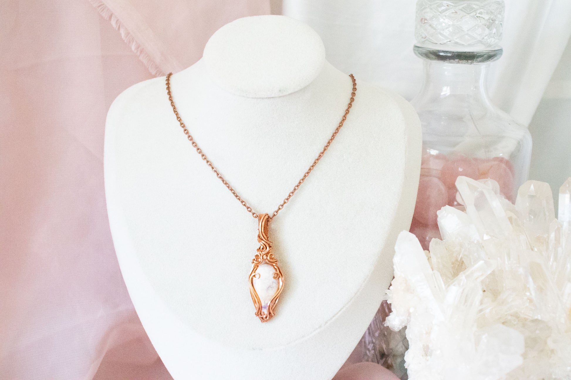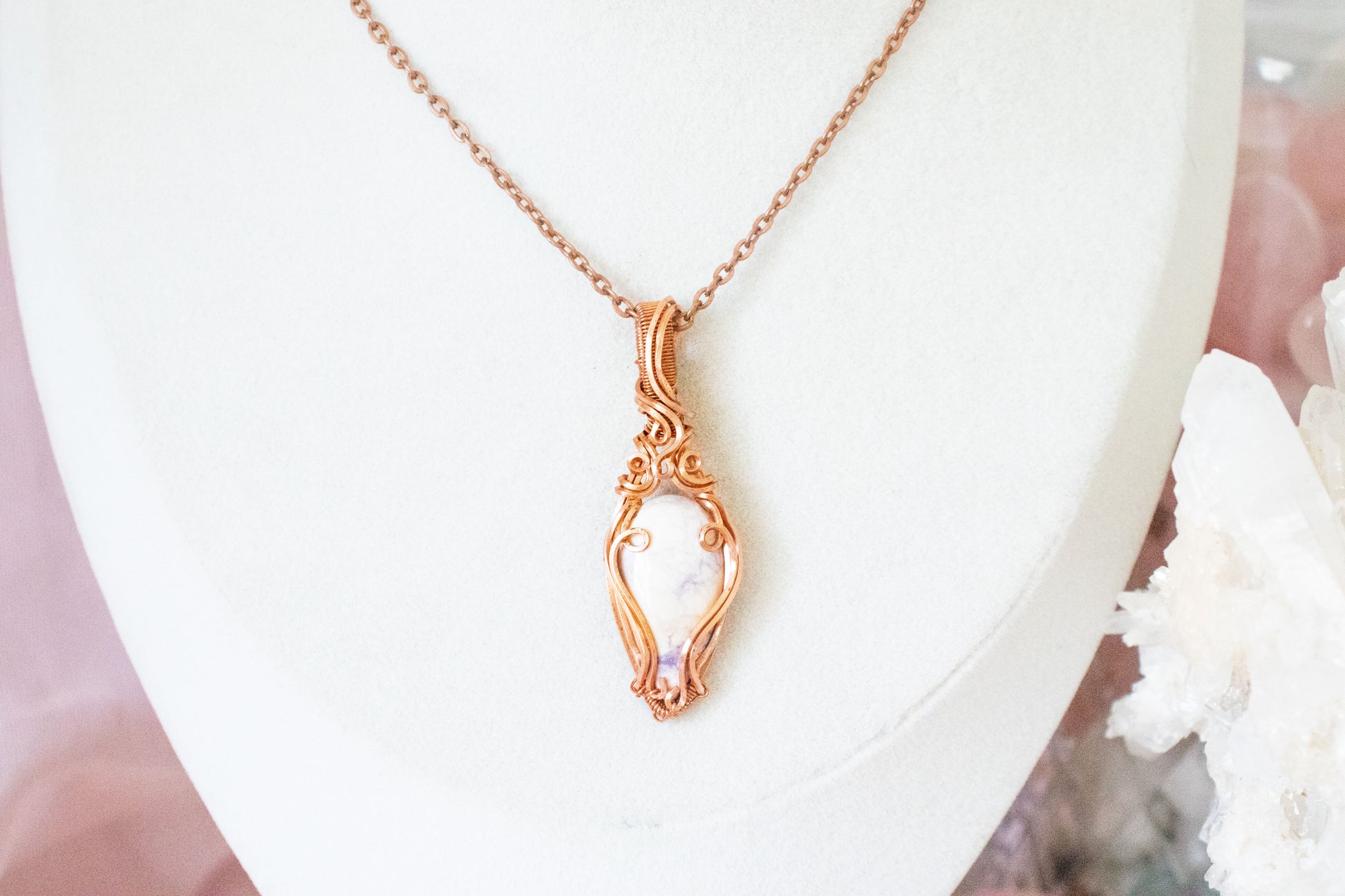 Made with tarnish-resistant copper copper wire, a pear tiffany stone, and 20" copper-colored chain.
