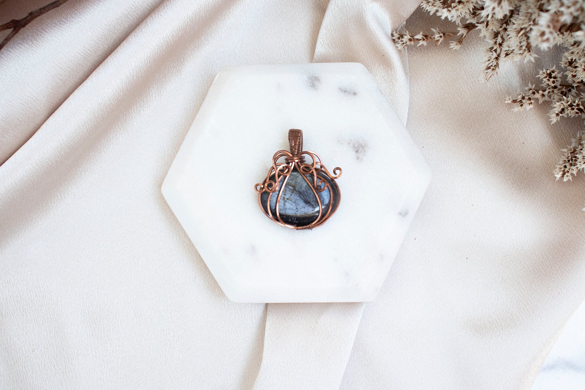 Copper pendants are not considered hypoallergenic. Pieces made with silver-plated wire are hypoallergenic and will remain so with proper care.