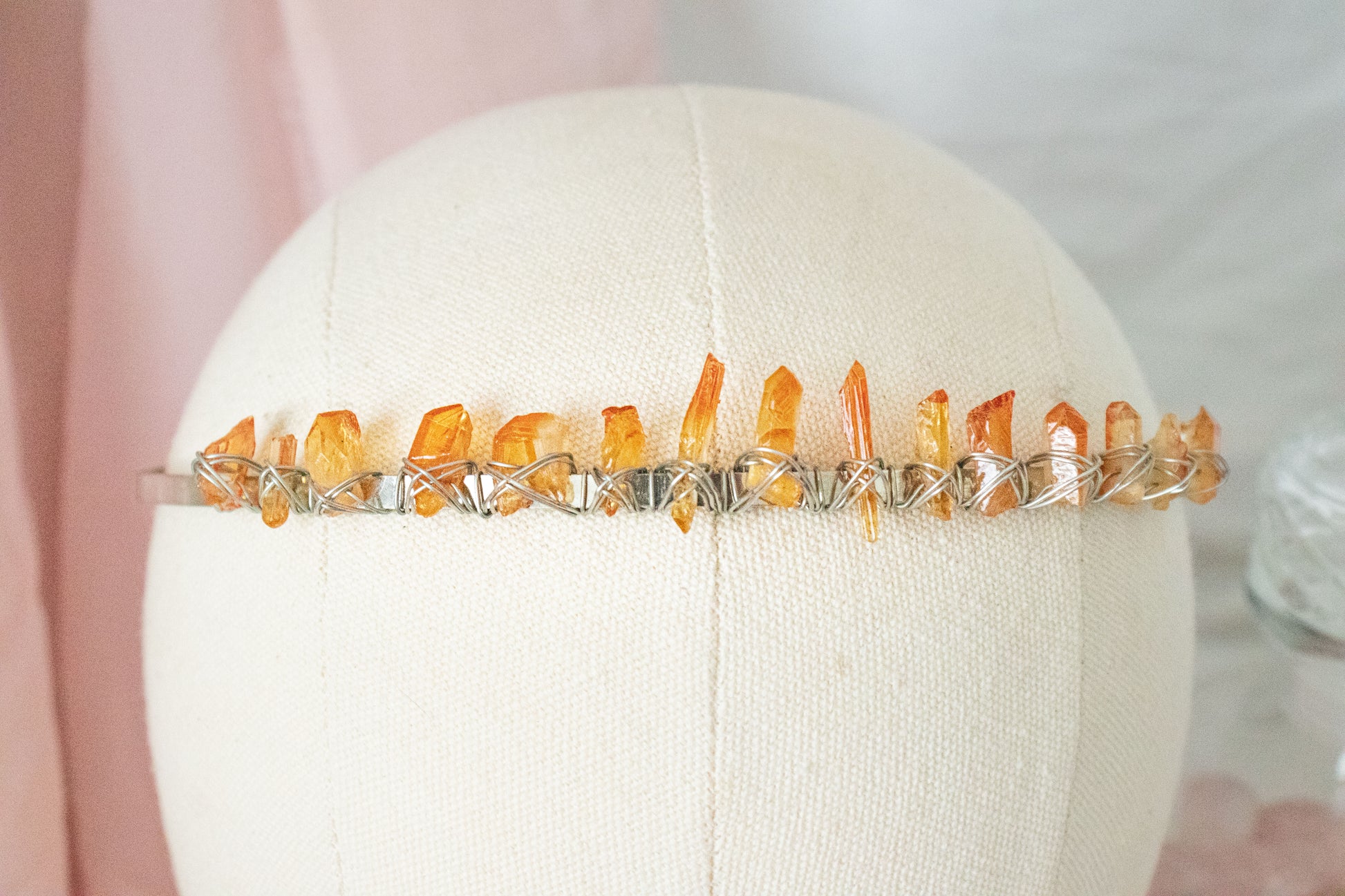 Add a mystical aura to any outfit with our orange crystal crown, adorned with enchanting crystal points. These crowns capture the essence of nature’s beauty, blending style with the energies of each hand-selected stone. Flexible and comfortable, each crown is crafted to bring an element of magic and uniqueness to any look.