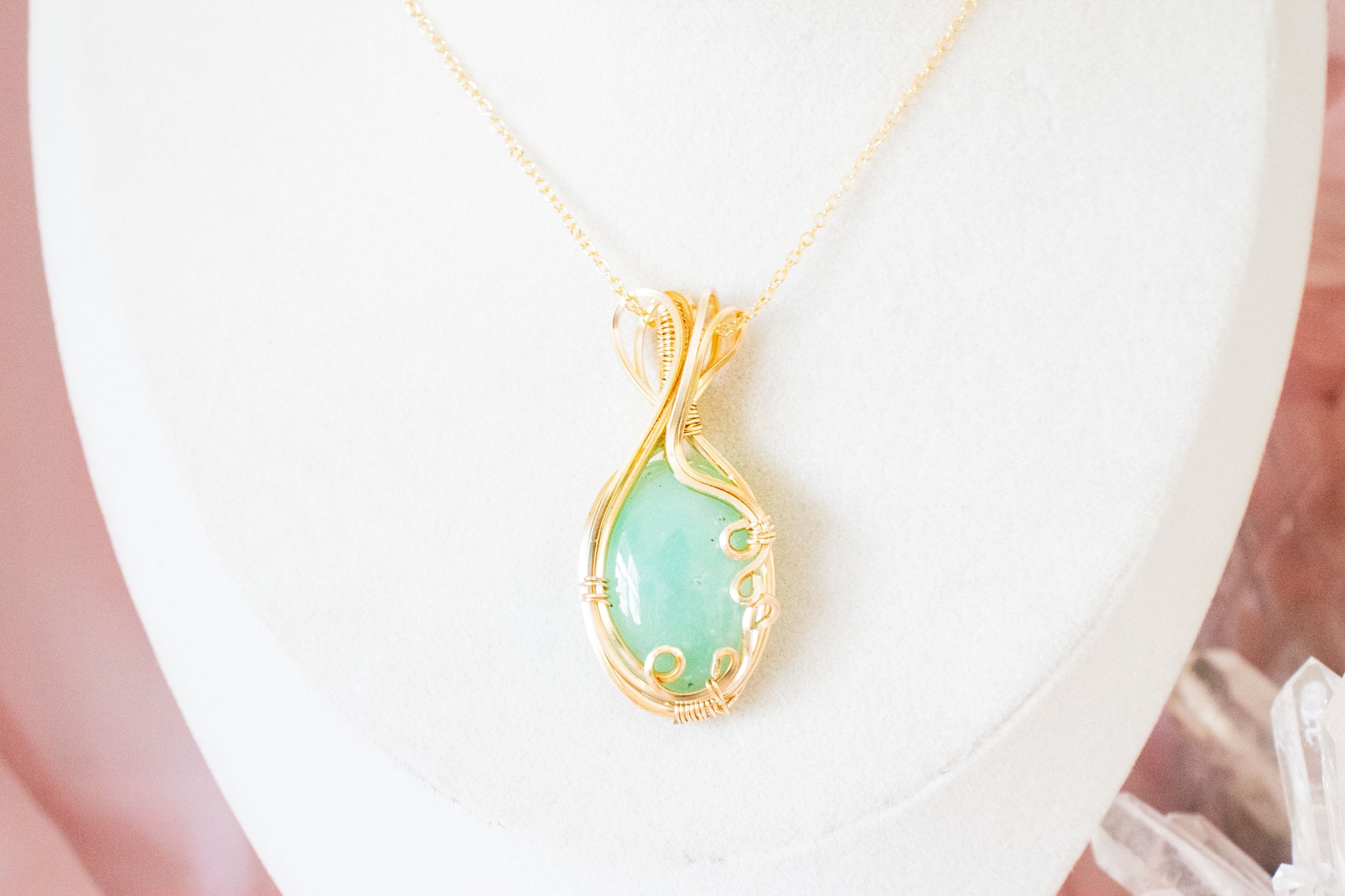 Made with silver-plated gold-colored wire, an oval chrysoprase stone, and 20" gold-colored chain.