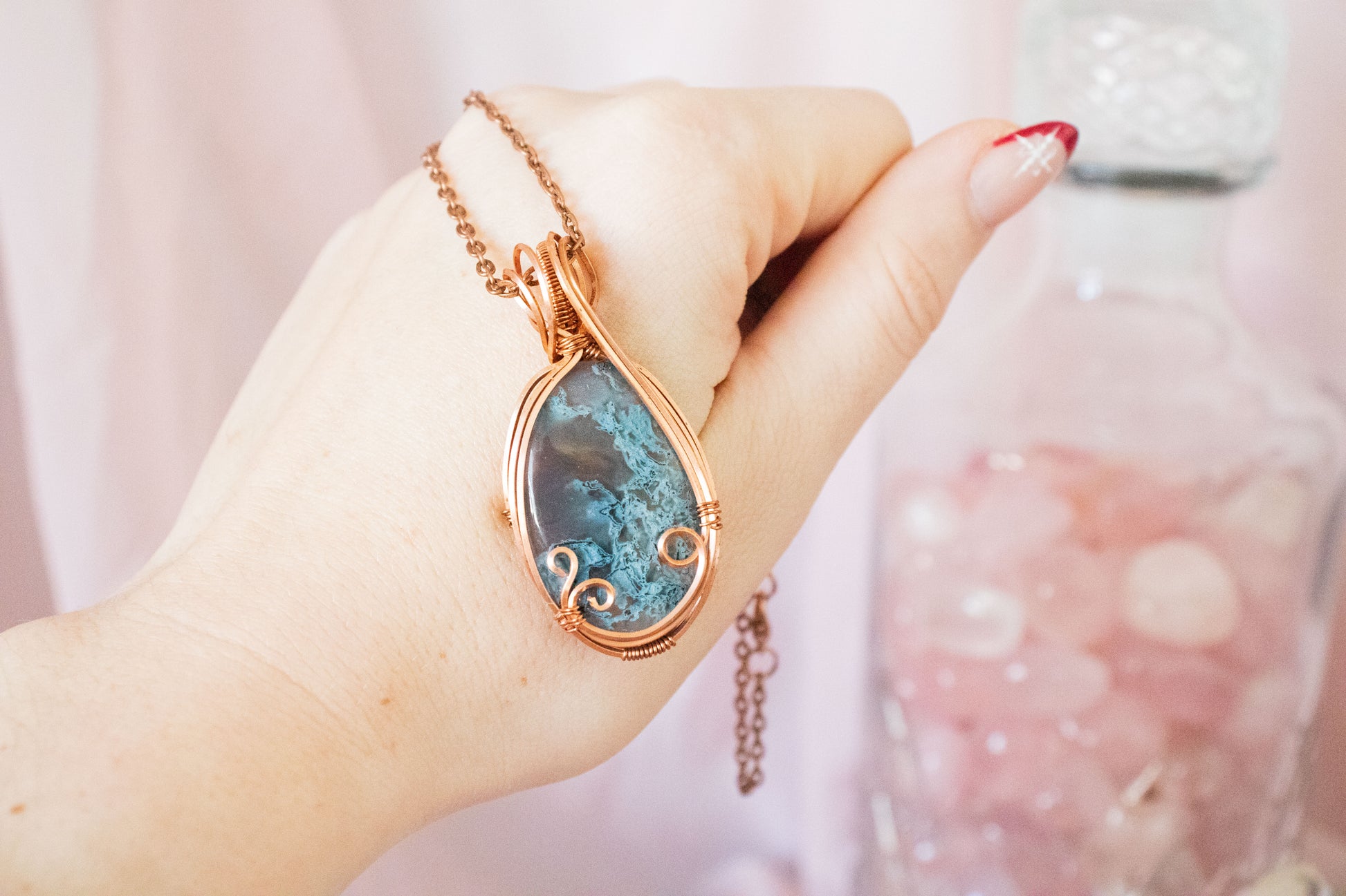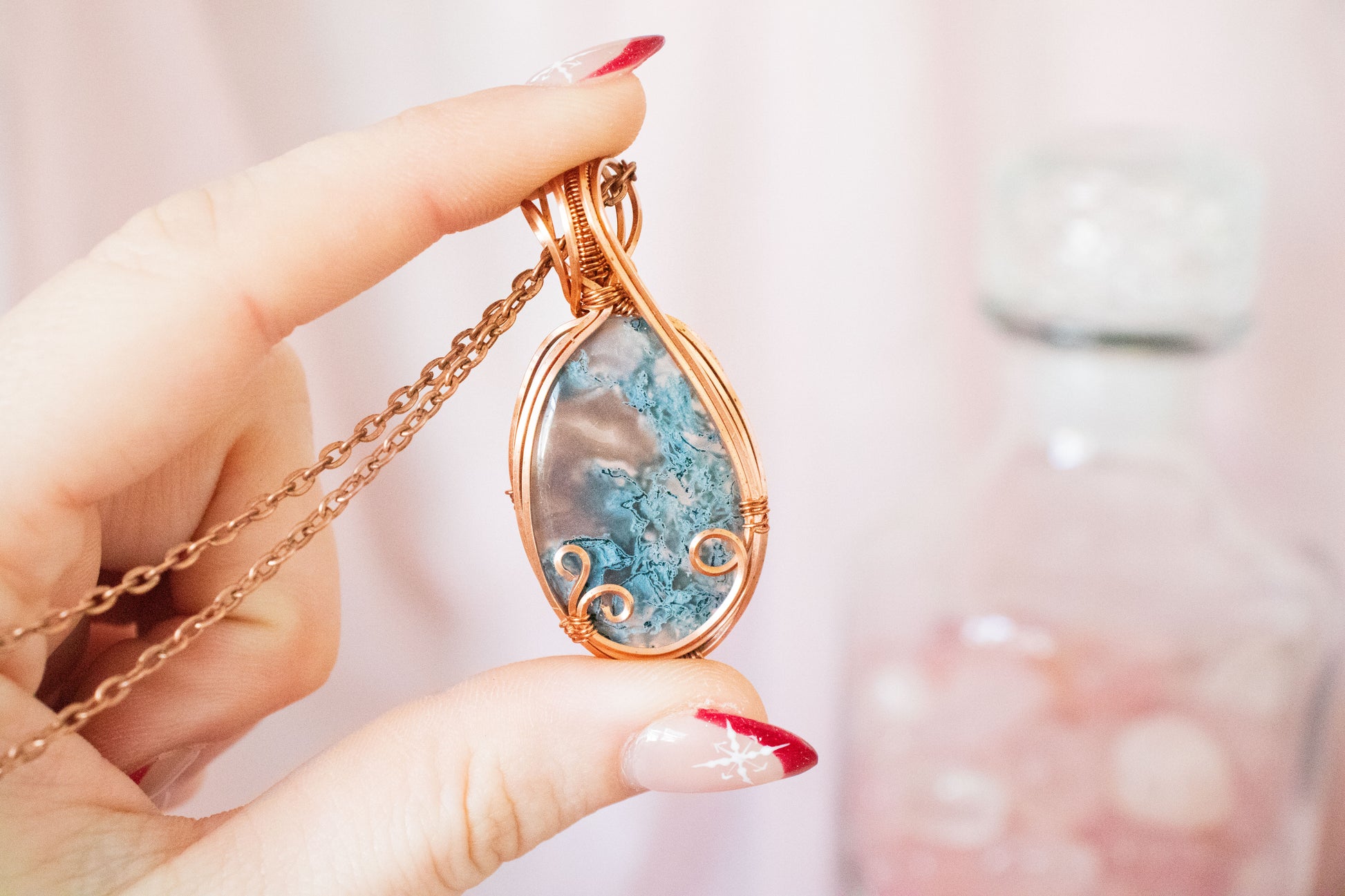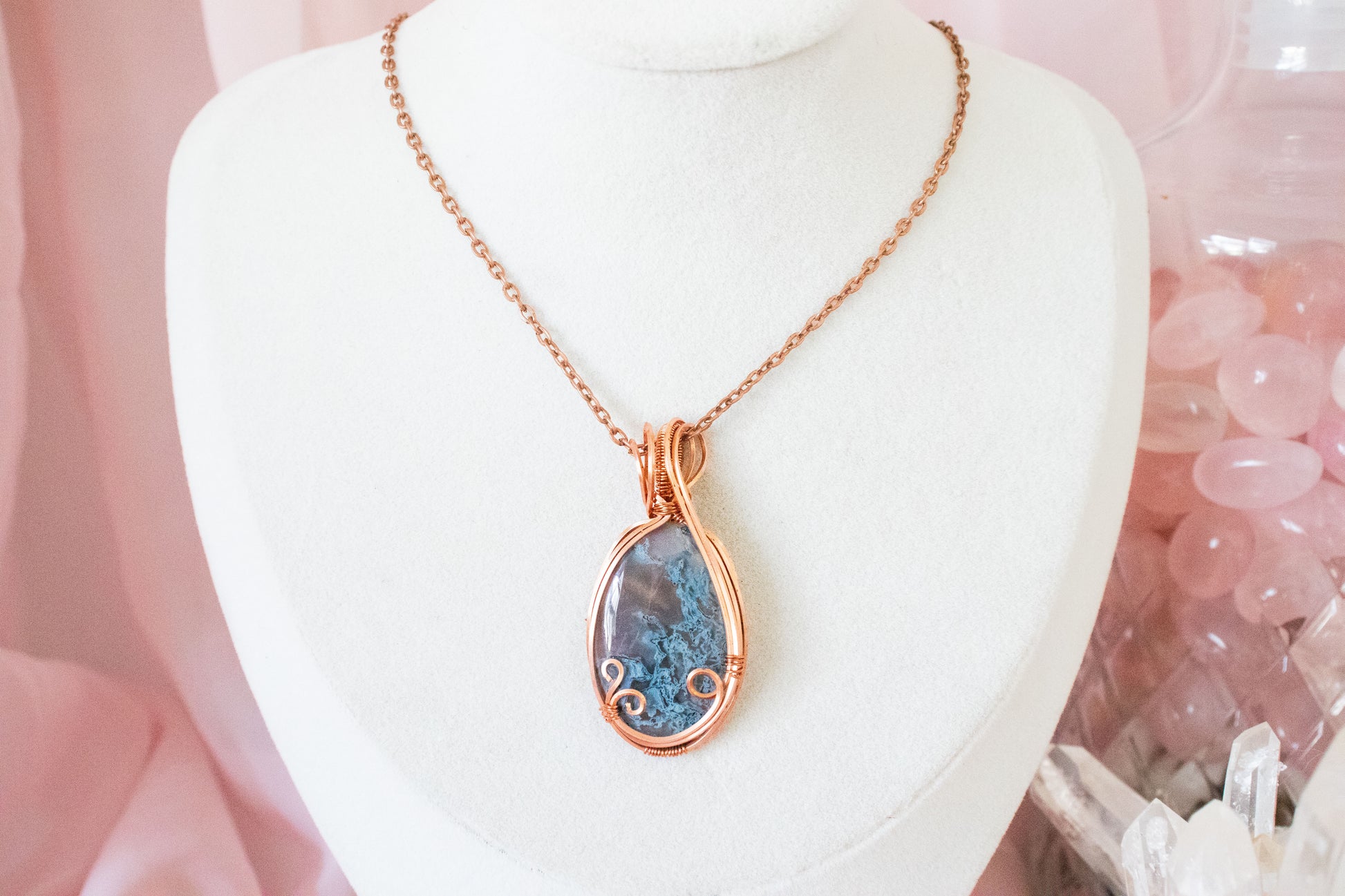 Made with tarnish resistant copper wire, an oval moss agate stone, and 18" copper-colored chain.