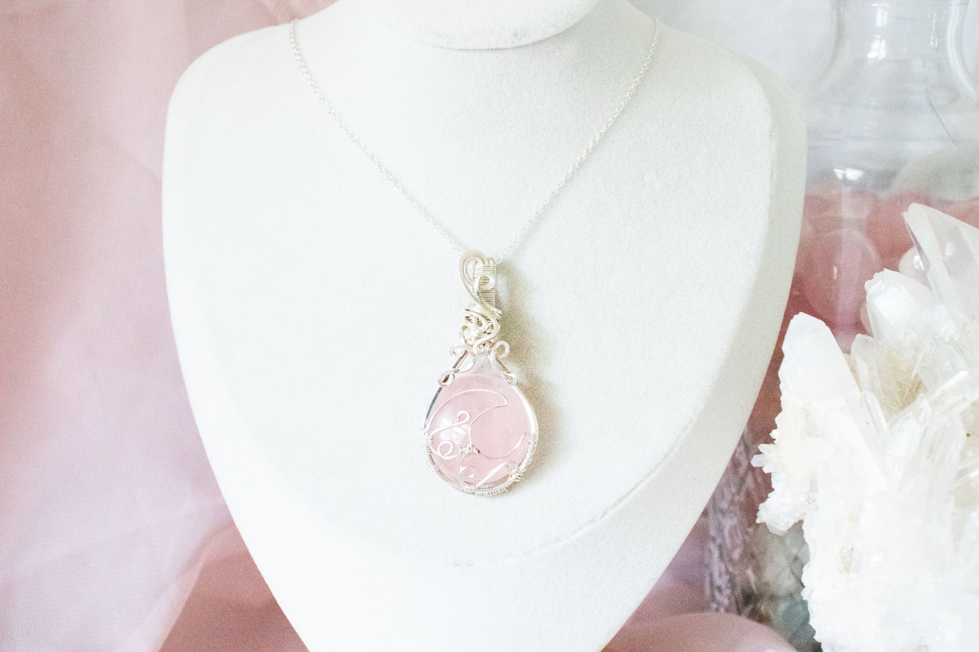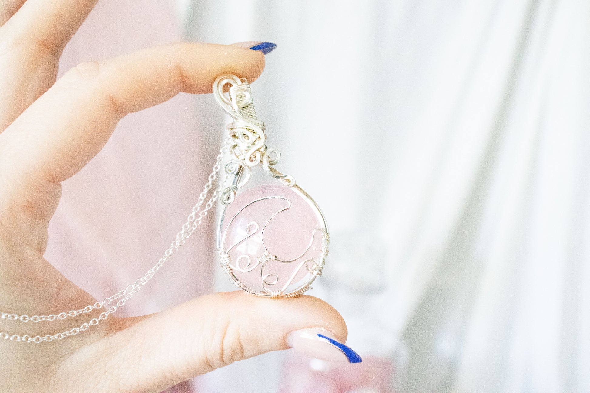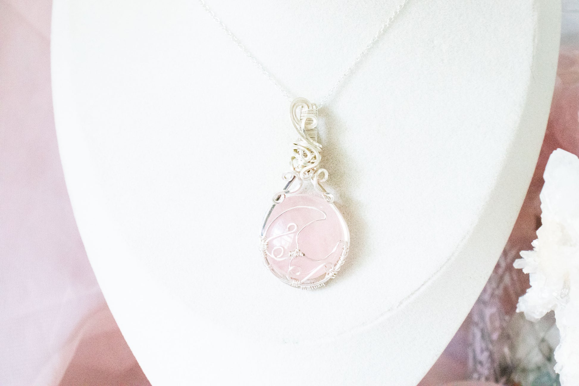 Made with silver-plated silver-colored copper wire, a round rose quartz stone, and 20" silver-colored chain.