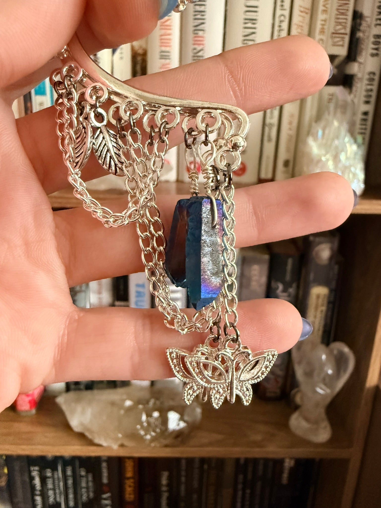 Ear cuffs feature silver chain, butterfly, leaf, and dark aura quartz charms.