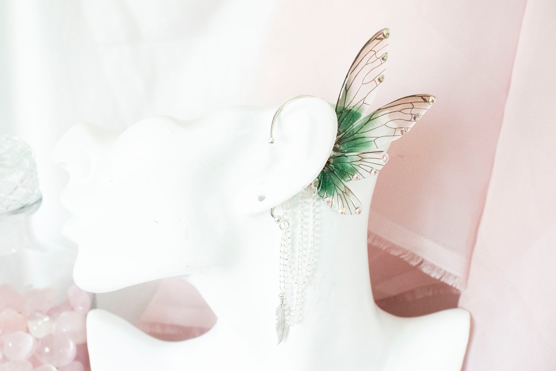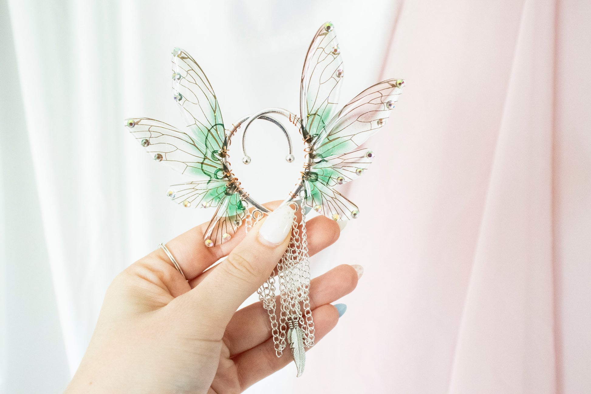 Ear cuffs feature green fairy wings, silver chain, and feather charms.