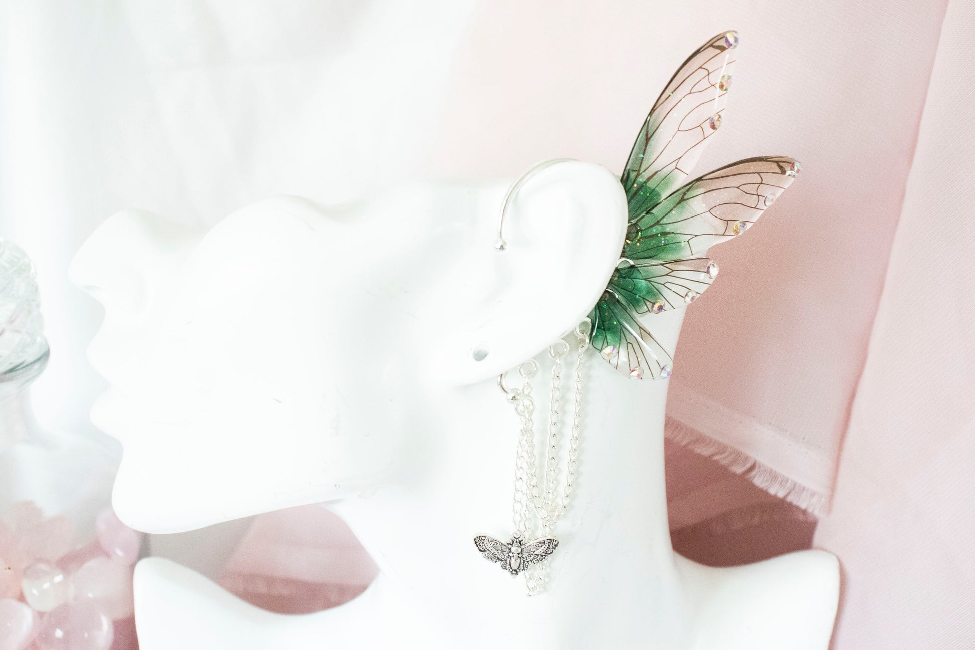 Ear cuffs feature green fairy wings, silver chain, and moth charms.