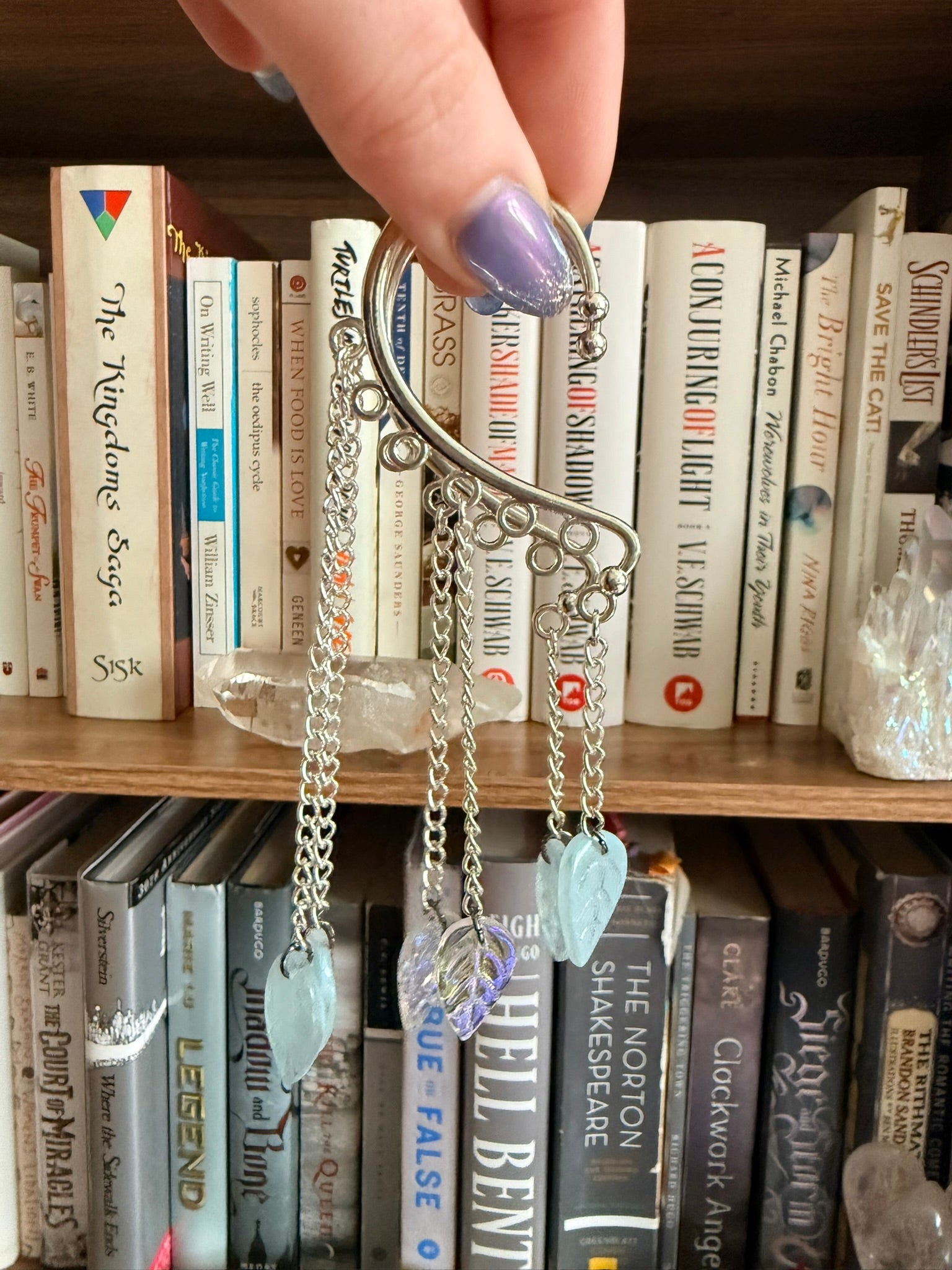 Ear cuffs feature silver chain, blue and moonstone glass leaf charms.