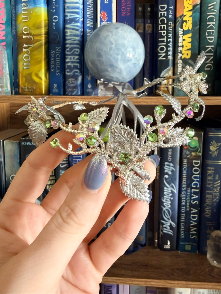 Embrace an elven-inspired elegance with our silver + lime green stag circlet tiara, designed to sit gracefully on the forehead. Each circlet is handcrafted with intricate detail to bring a mystical charm that elevates any outfit. Flexible and lightweight, it comfortably molds to your head, giving you the timeless beauty of fantasy realms with a real-world touch.