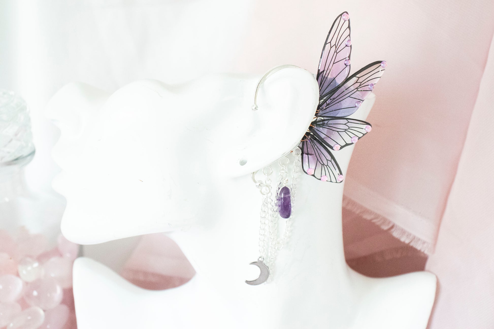 Ear cuffs feature purple fairy wings, silver chain, amethyst crystals, and moon charms.