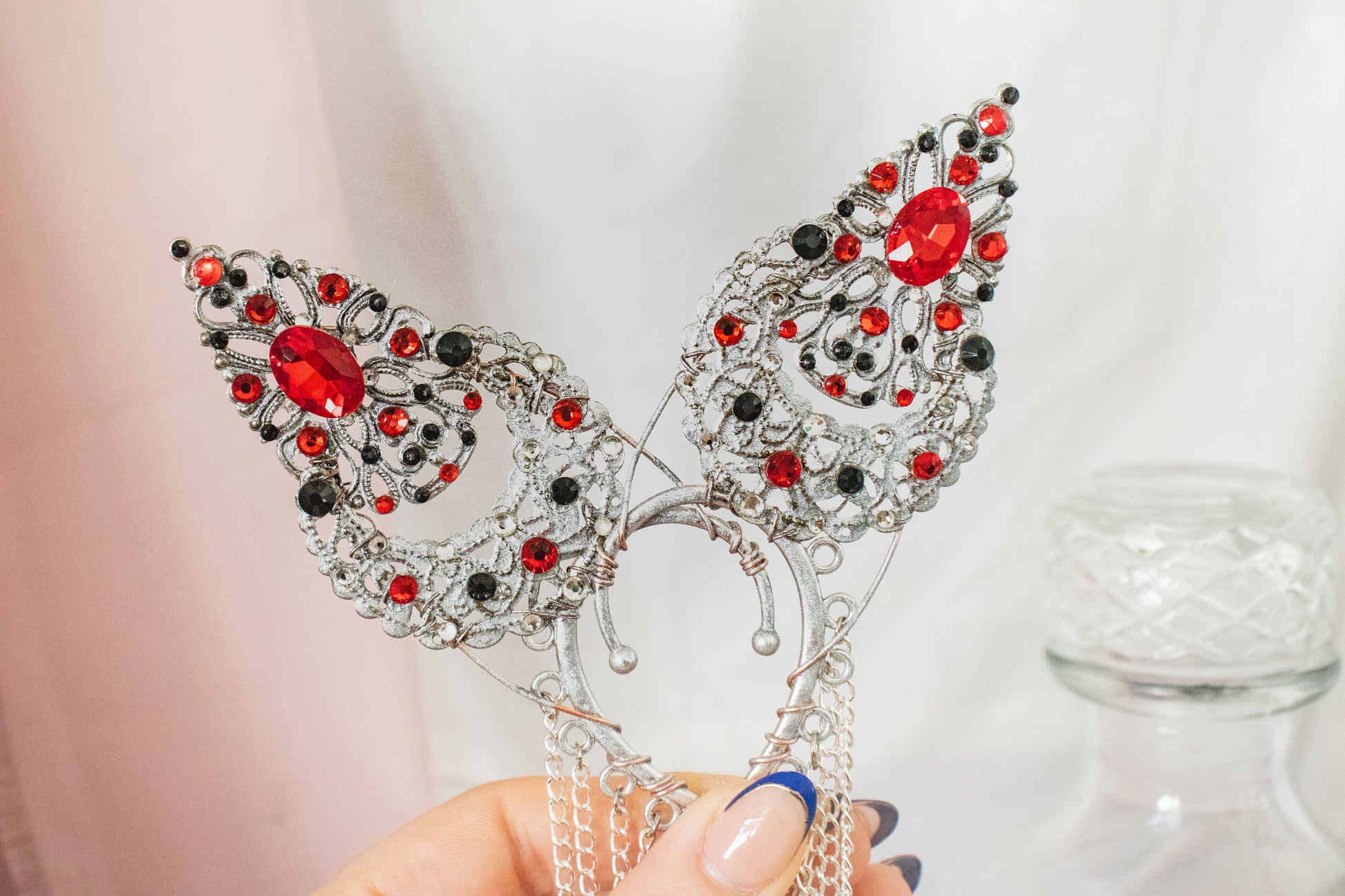 Step into a realm of fantasy with our Silver + Red Short Elf Ear Cuffs, designed to give you the enchanting appearance of elven ears adorned with sparkling jewels. Perfect for those who seek a touch of magic in their look, these cuffs wrap gracefully around the back of the ear, blending elegance with a mystical charm. Each pair is handmade, ensuring a unique design that lets you carry a piece of the elven world wherever you go.