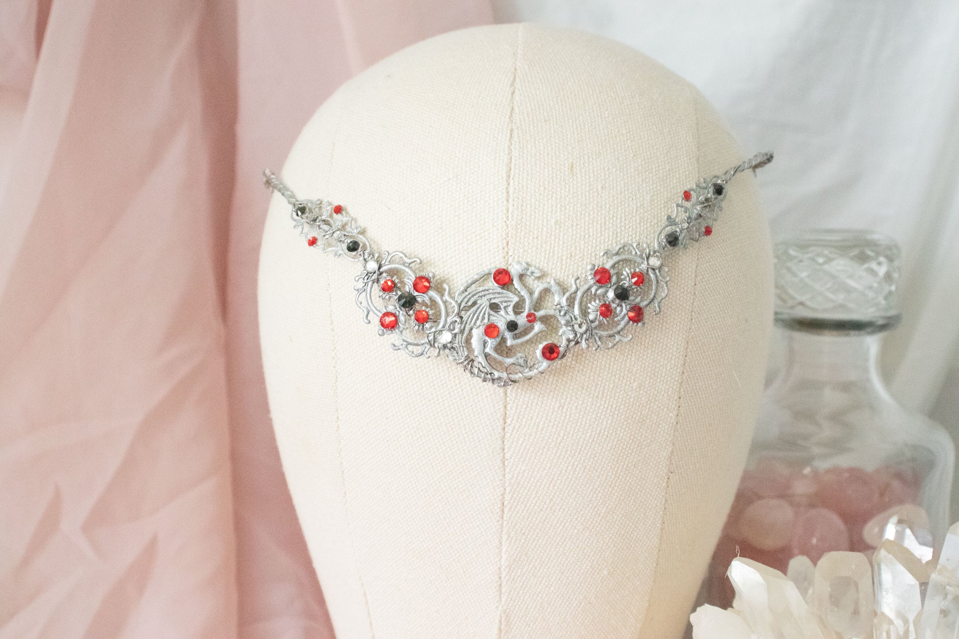Embrace an elven-inspired elegance with our silver + red "Targaryen" inspired dragon circlet tiara, designed to sit gracefully on the forehead. Each circlet is handcrafted with intricate detail to bring a mystical charm that elevates any outfit. Flexible and lightweight, it comfortably molds to your head, giving you the timeless beauty of fantasy realms with a real-world touch.