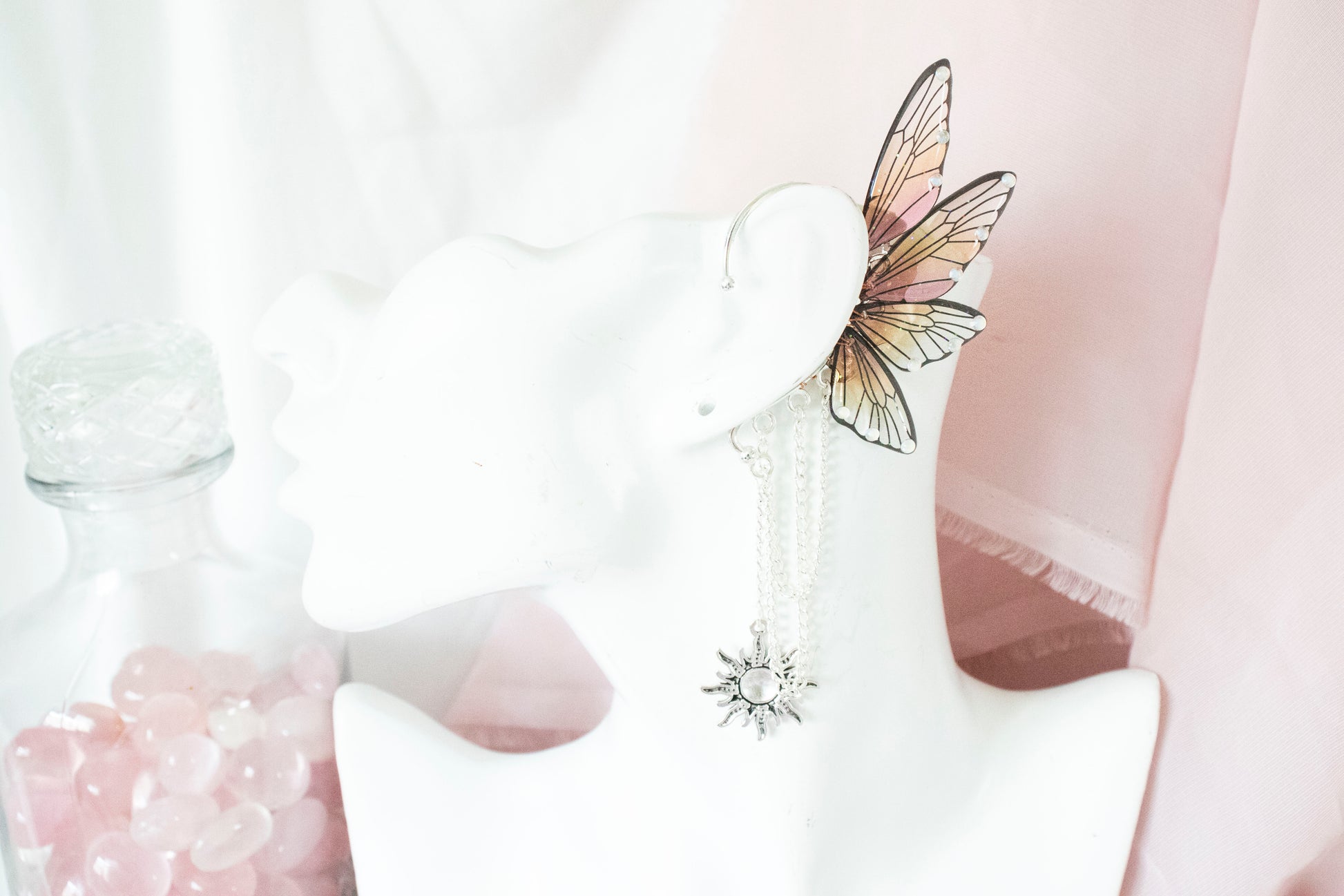 Ear cuffs feature sunset fairy wings, silver chain, and sun charms.