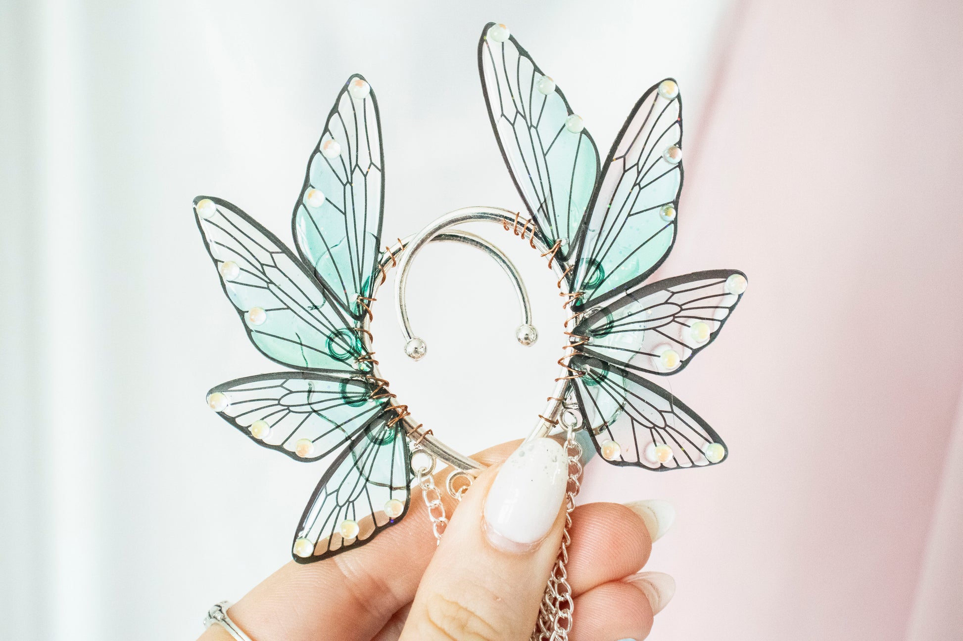 Ear cuffs feature teal fairy wings, silver chain, and feather charms.